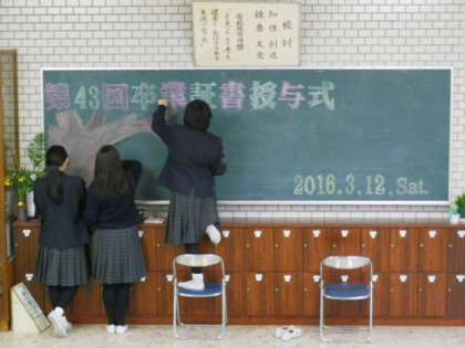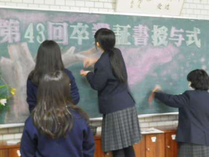 43期生の卒業式に向け、文芸部員が玄関ホールの黒板に お祝いの絵を描いてくれています。