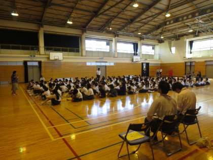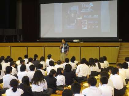 1年生では、5月に三原養護教諭が学級単位で「たばこの害」について授業をし、たばこの有毒性を学習しました。そして、今日の6時間目は、体育館で薬剤師の大内啓子先生にお越しいただき、覚せい剤やMDMA、大麻などの薬物が持つ常習性や依存性を学習し、身体をむしばんでいく怖さを学習しました。