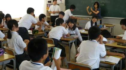 1年4組の英語の授業。どうやら、英語での伝言ゲーム(?)のようです。正しい英会話でどれだけ早く相手に伝えることができたでしょうか?