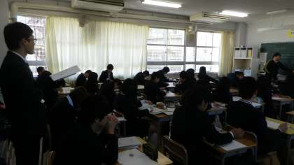 上は3限目の数学の時間。今週は、教員の「授業交流週間」として、可能な時間に互いの授業を見学し合い、授業の進め方について勉強し合うことにしています。この時間も同じ数学科の他学年の教員が見学しています。