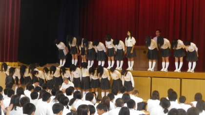 全学年ともにいつも感心する集会の態度。おしゃべりする声が全く聞こえないきちんとした態度の中、校長からの話、教頭からの話、バレーボール部の表彰… と式はスムーズに進みます。