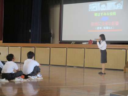 1年生は5時間目、兵庫教育大学から講師を招いて情報モラル教室を行いました。3つの動画を見てそれぞれについて考えていきます。テーマは、デマの投稿、危険なアプリのダウンロード、ネット依存でした。この動画は、ネットのトラブルの状況から毎年少しずつ新しい動画を作成しているとのことでした。1年生はそれぞれの小学校の時にも学習した経験があるようですが今回も勉強になったと思います。一度投稿した画像などは自分が削除しても拡散して決して消えることは無いこと、ネットの中には嘘の情報もたくさんあり自分で判断することが大切であることなど一つずつ、説明をしていただきました。