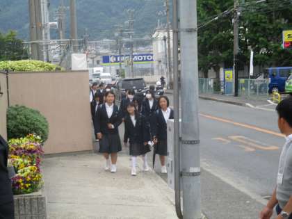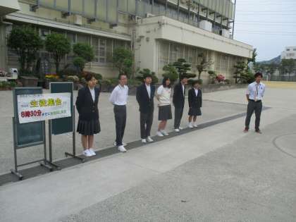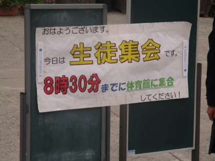 今日は集会があるので生徒会の役員があいさつ運動をしながら早く集合するよう呼びかけています。