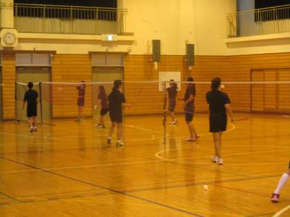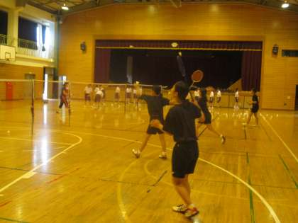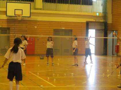 バドミントンは風がふくとプレーが困難になるので熱い夏は大変です。体育館でも熱中症に注意しながらの練習です。