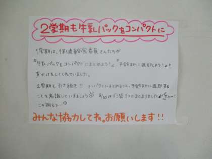 2枚目は掲示板の脇に貼ってあります。先学期後半に意識できた牛乳パックの片付けについてです。当たり前のことをみんなでやりきれるかが、集団の力です。