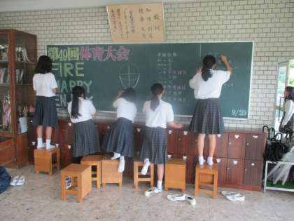玄関前の黒板は体育大会をテーマにしたものに変更中です。生徒達が頑張ってくれています。(1枚目)
