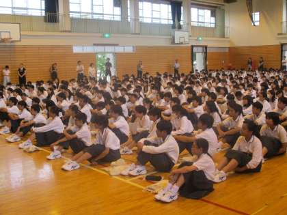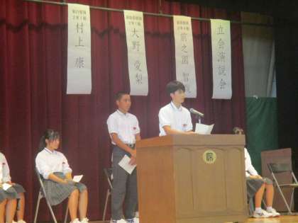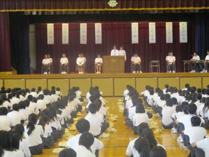 6時間目は後期生徒会役員選挙でした。7人の候補者とその応援演説者が全生徒に向かってアピールしました。