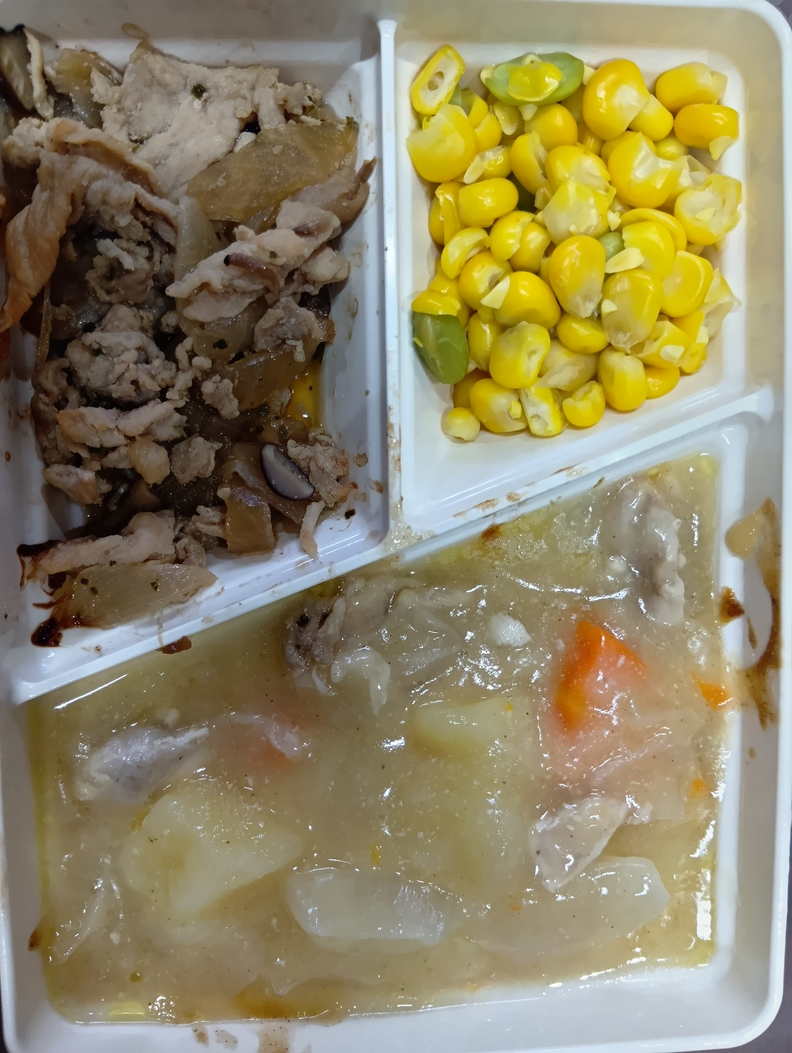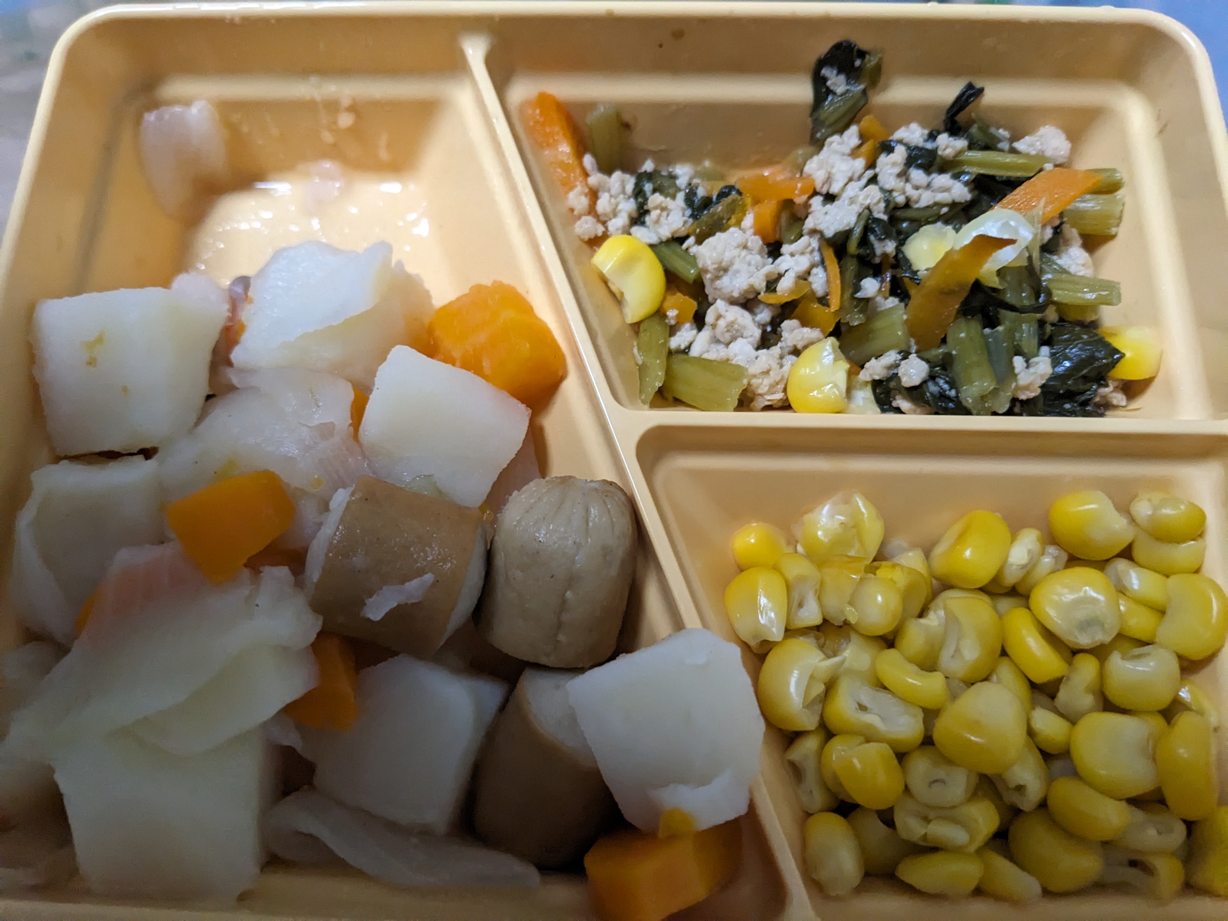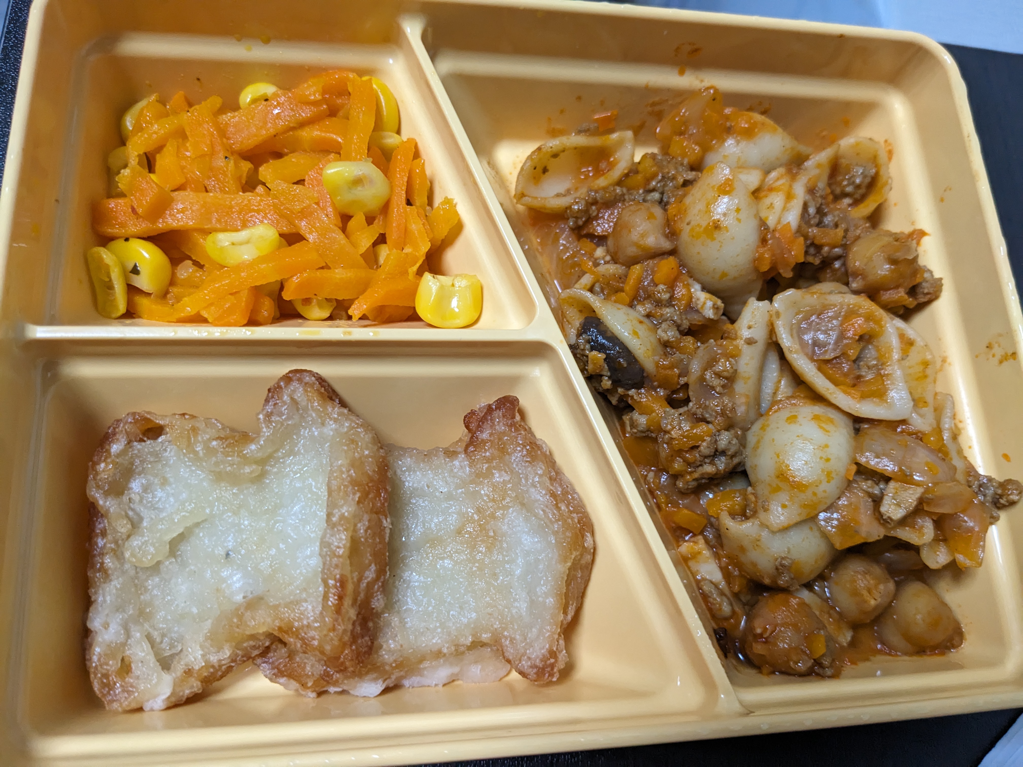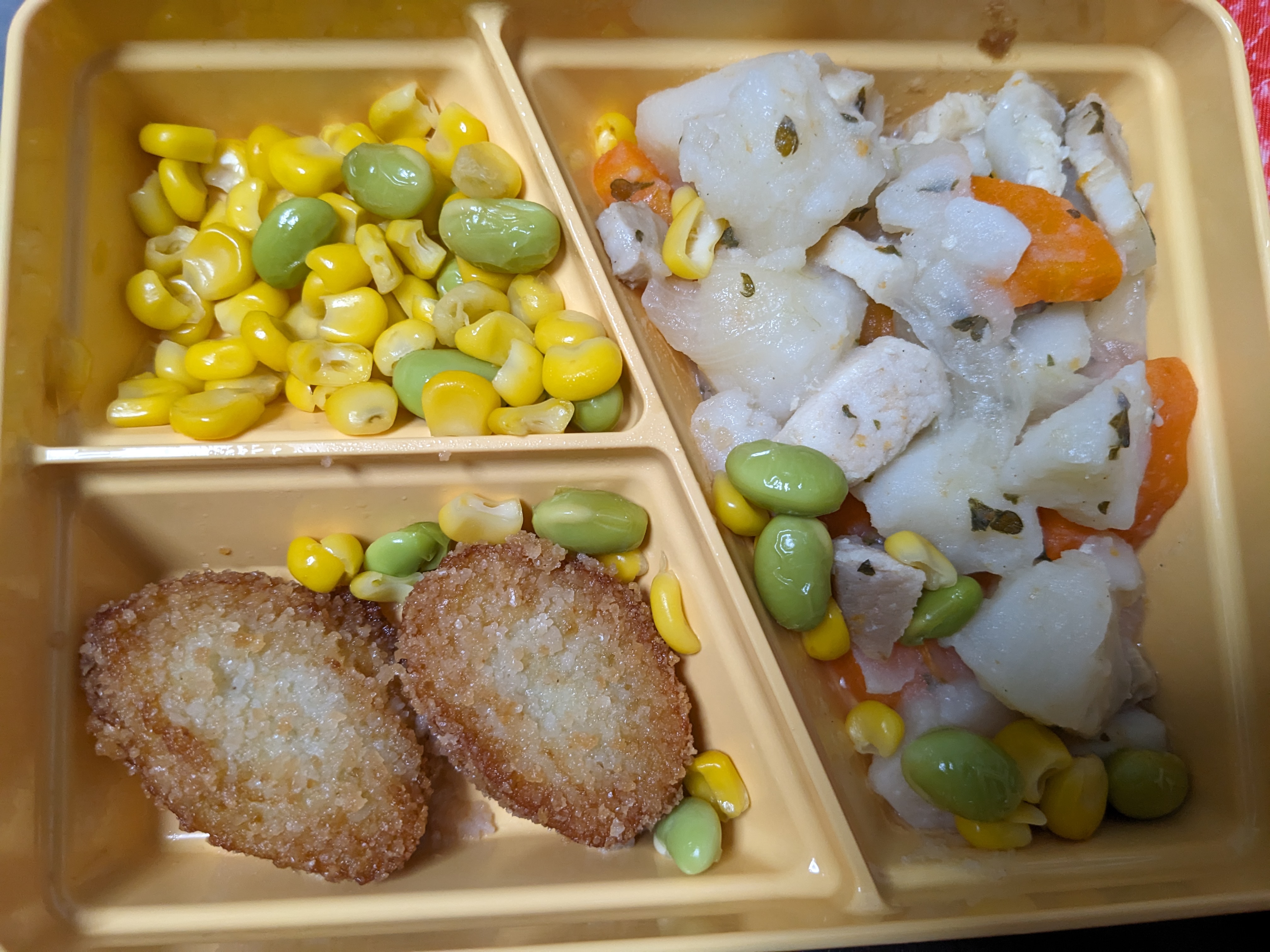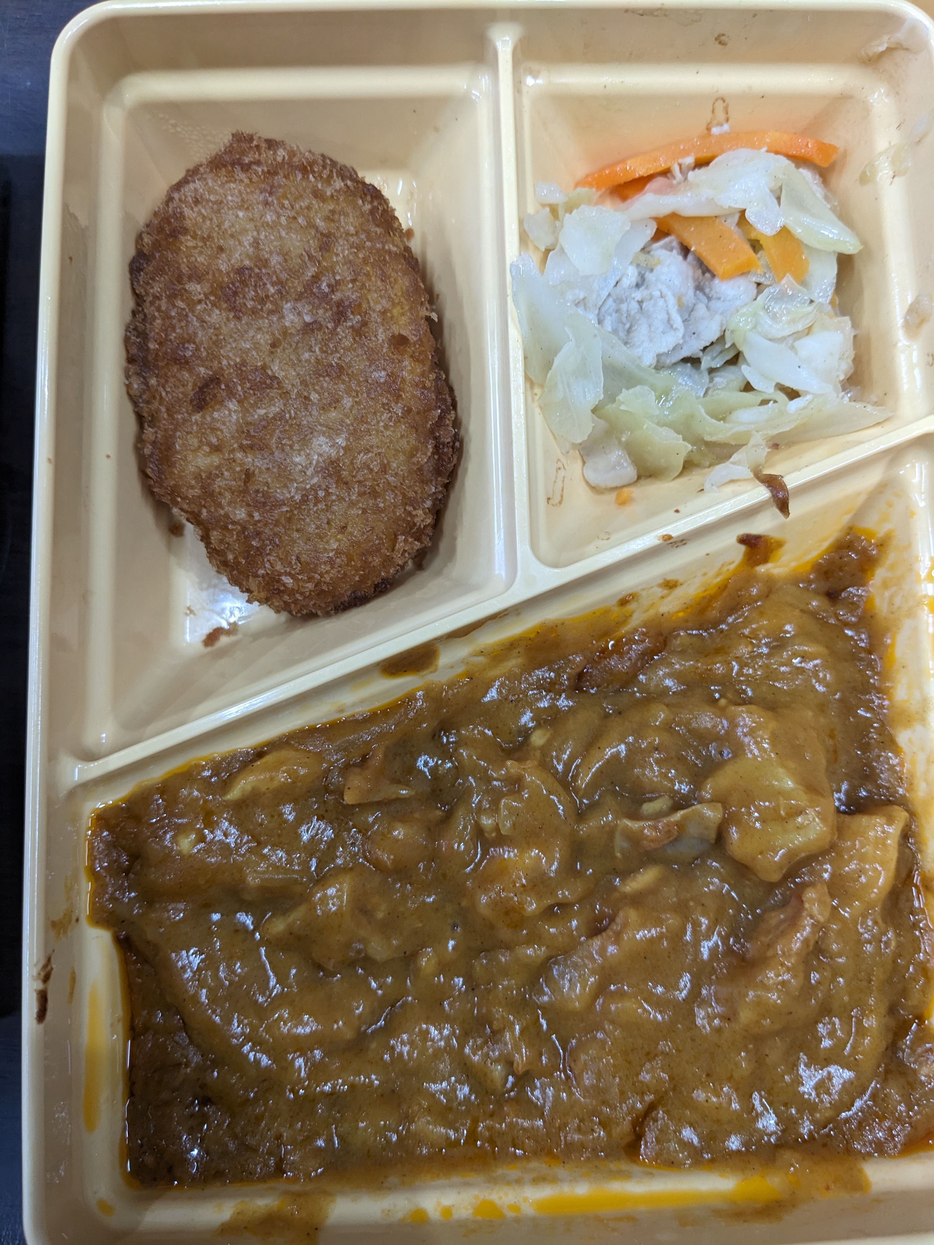 白ご飯・もち玄米ごはん・コーンコロッケ・ごぼうサラダ・チンゲン菜の炒め物・チキンカレー・牛乳