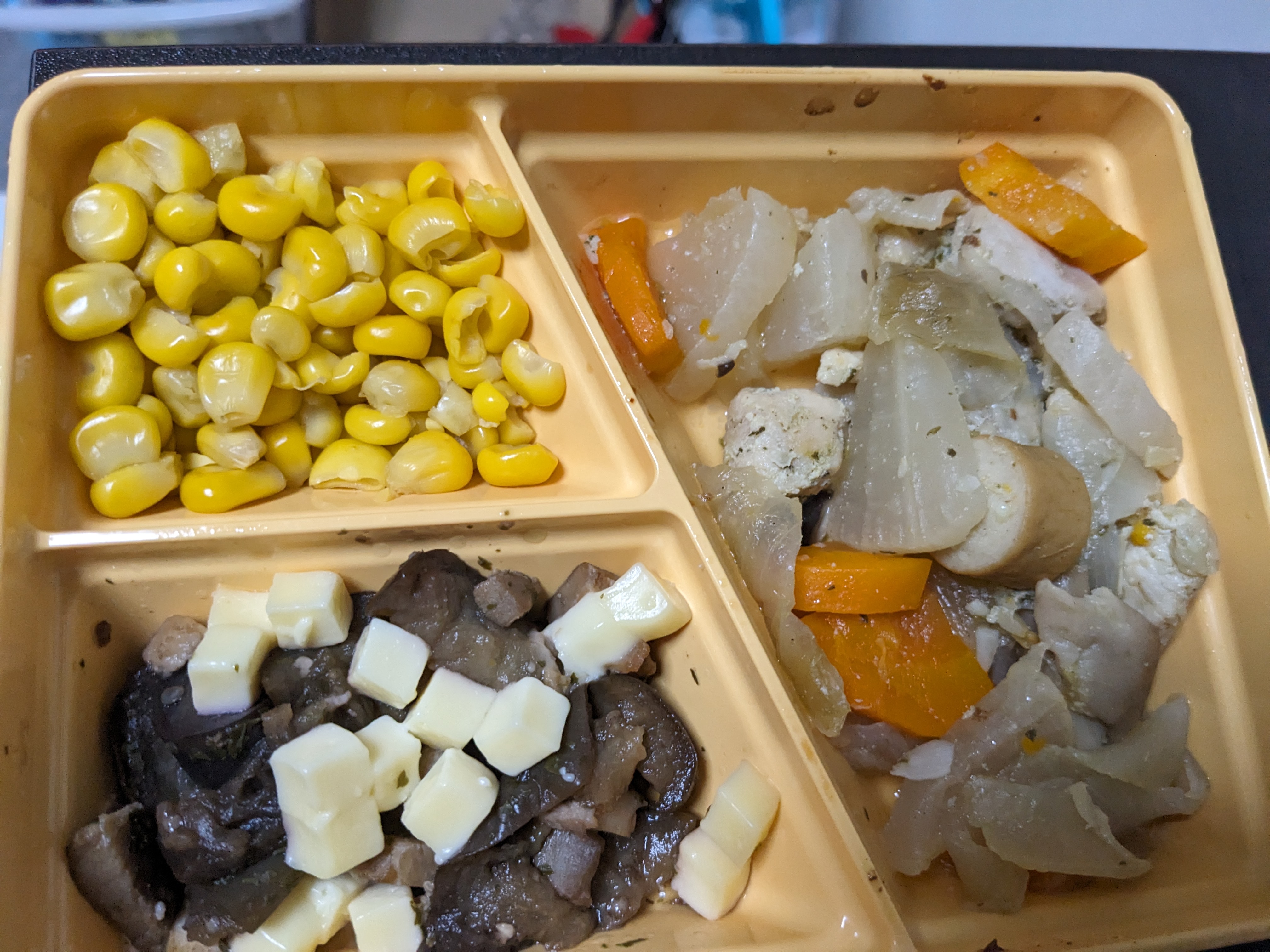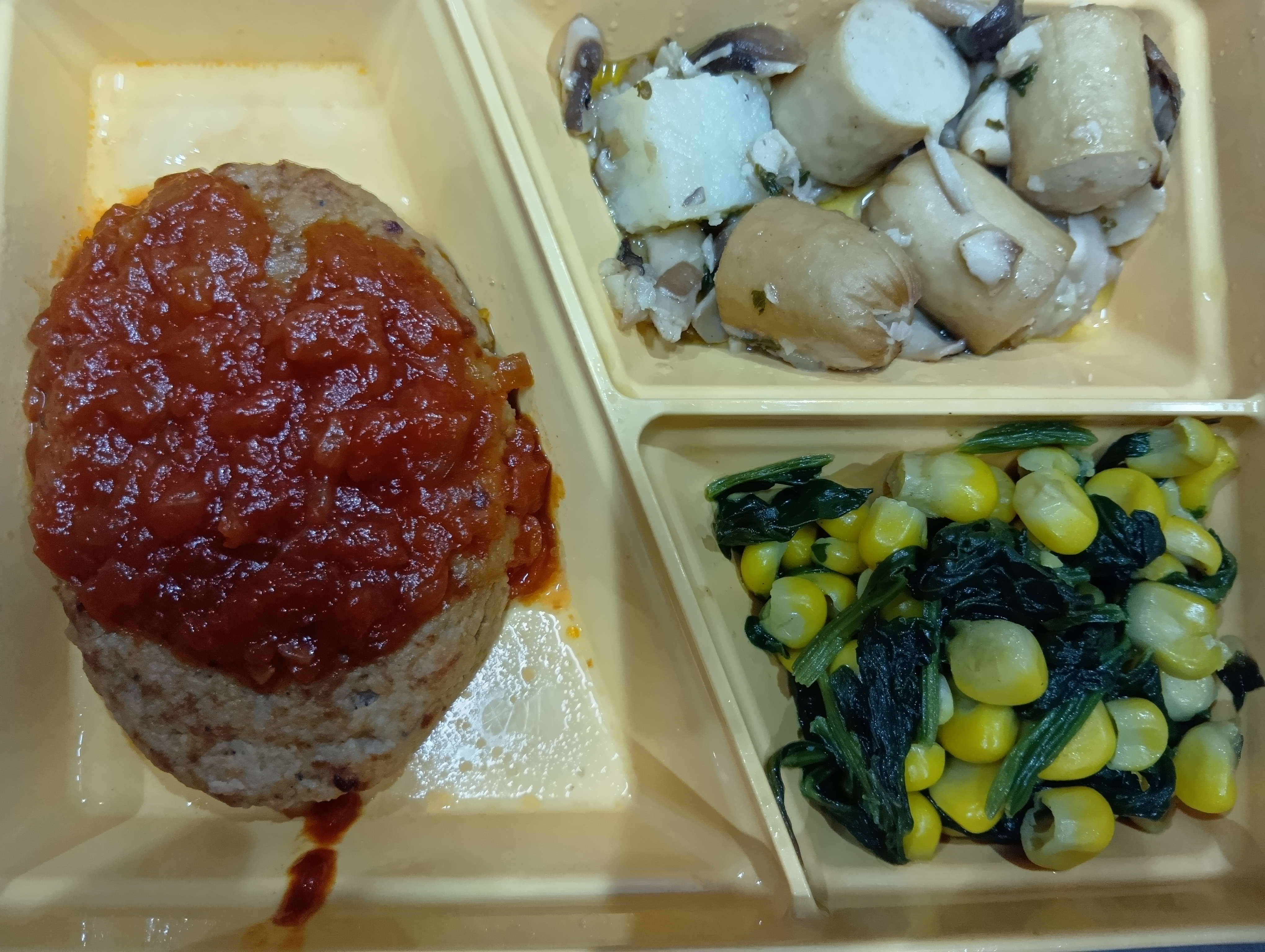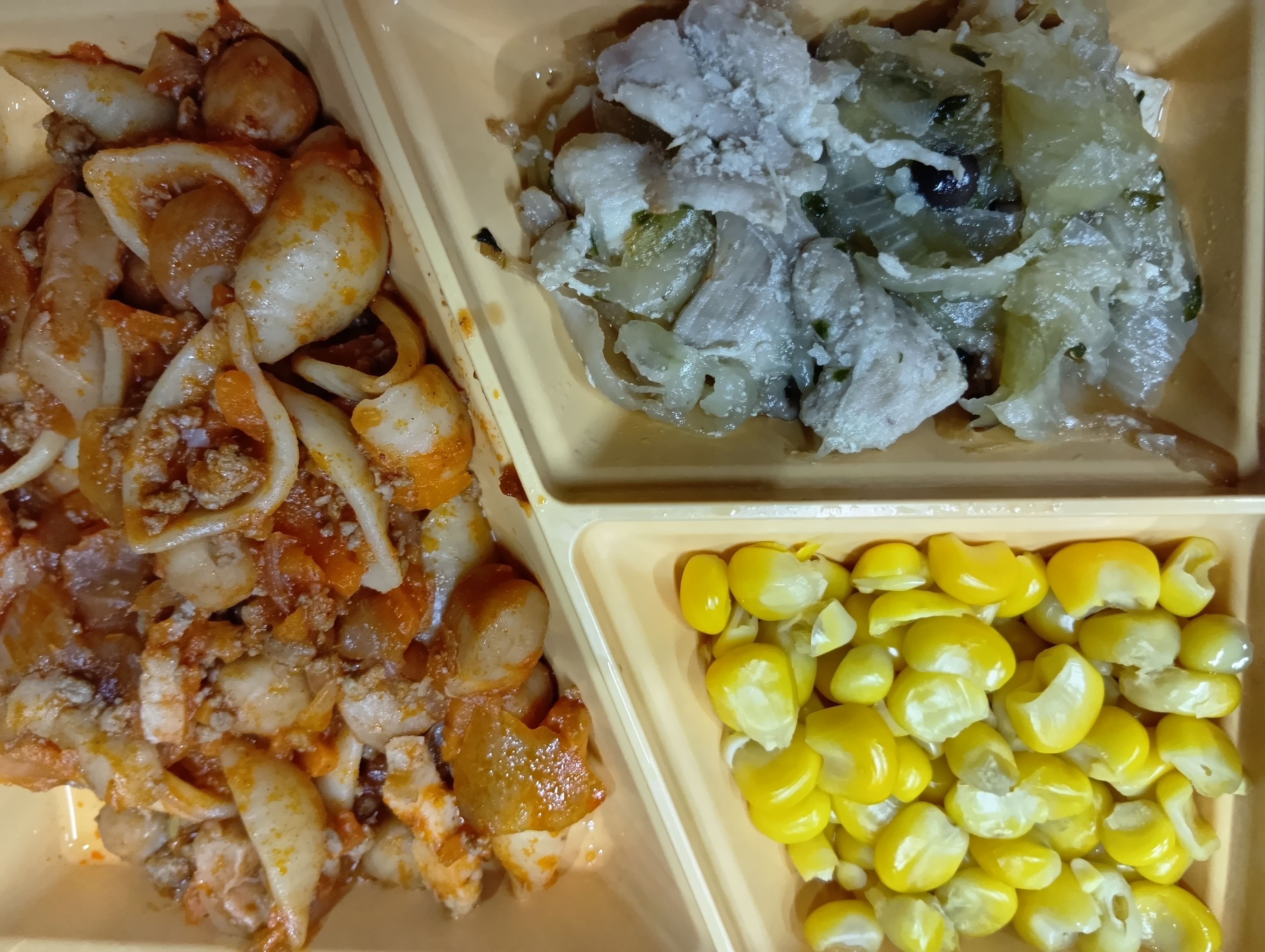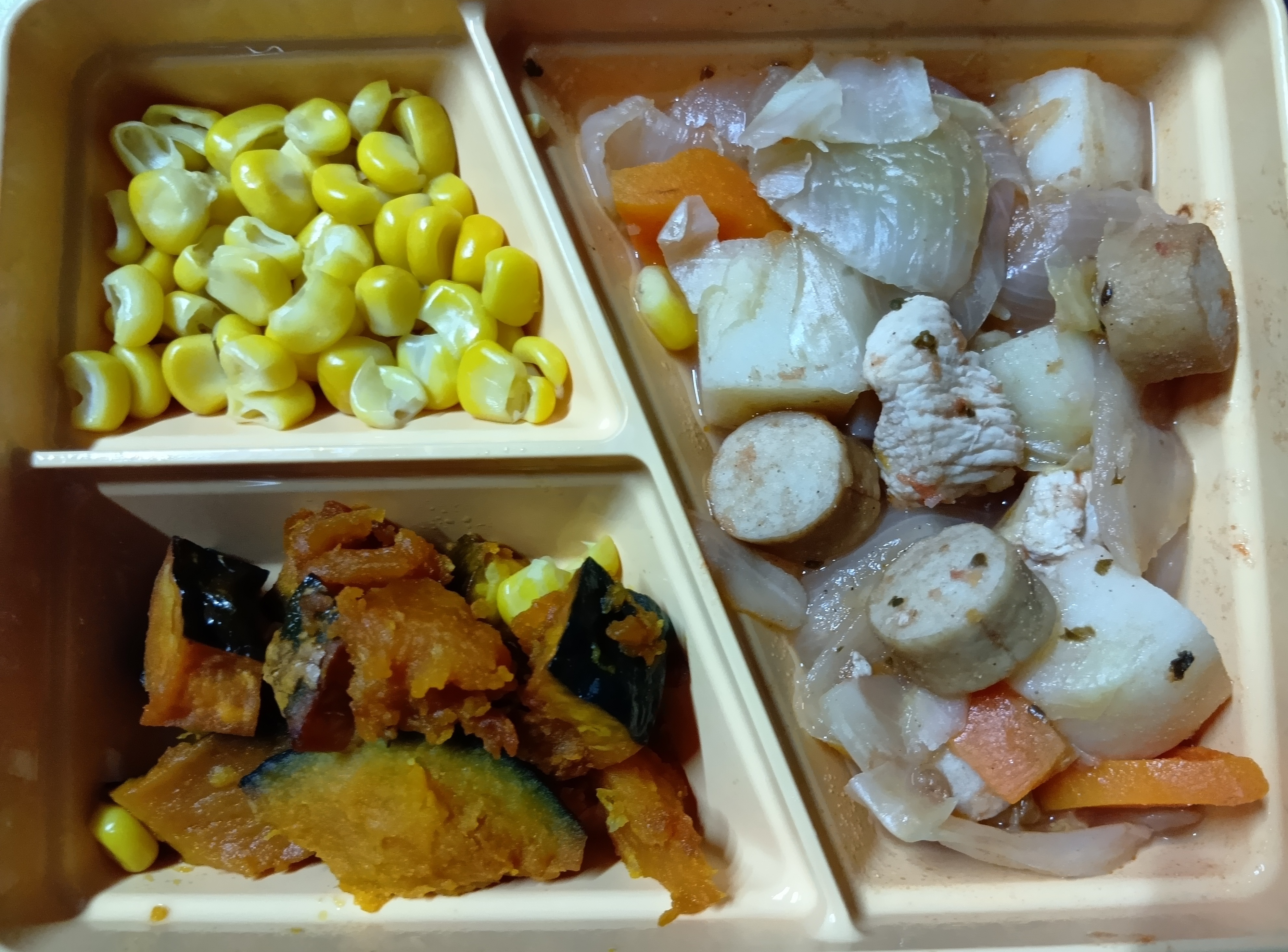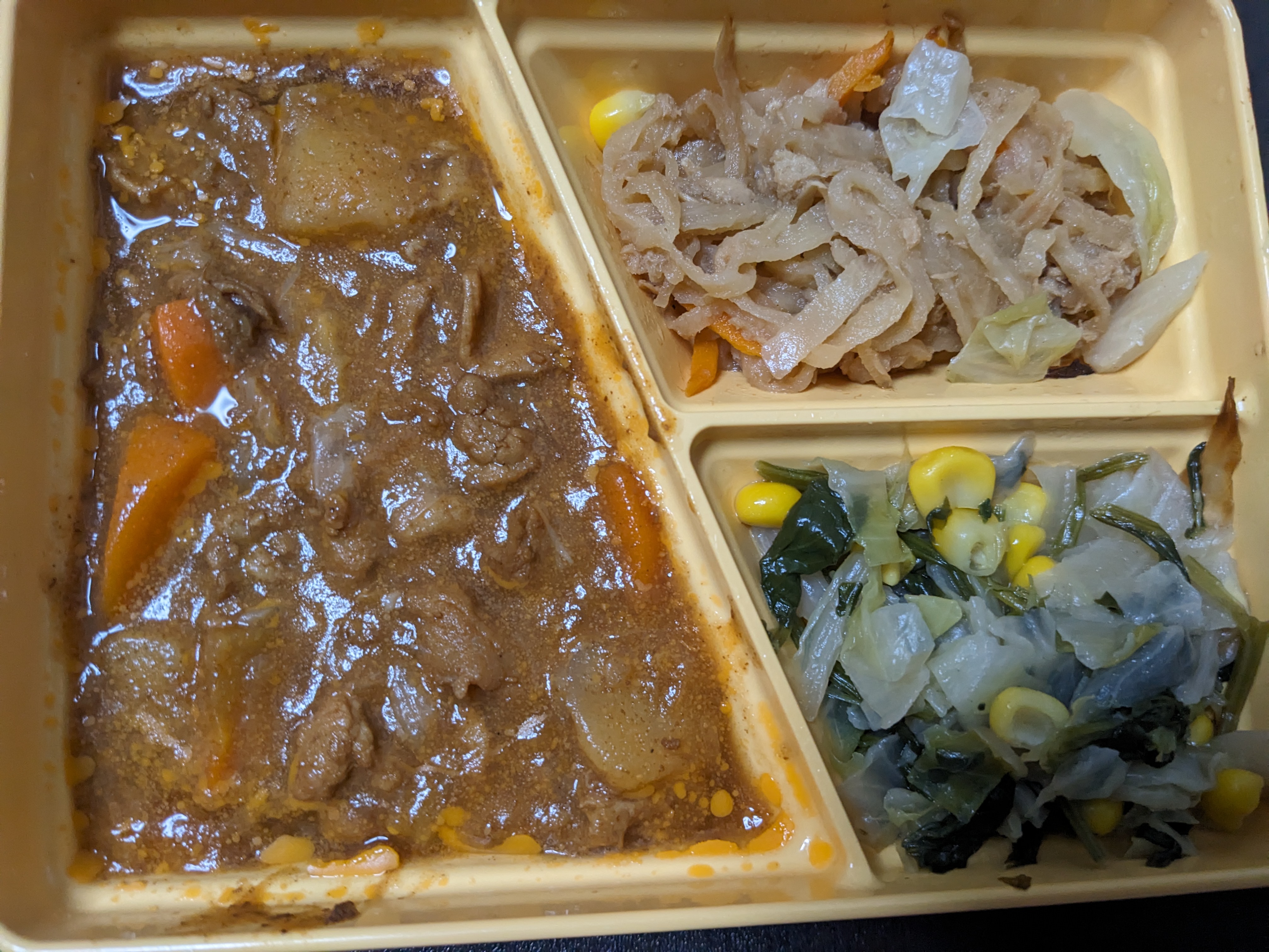 白ご飯・もち玄米ごはん・コーンコロッケ・ごぼうサラダ・チンゲン菜の炒め物・チキンカレー・牛乳