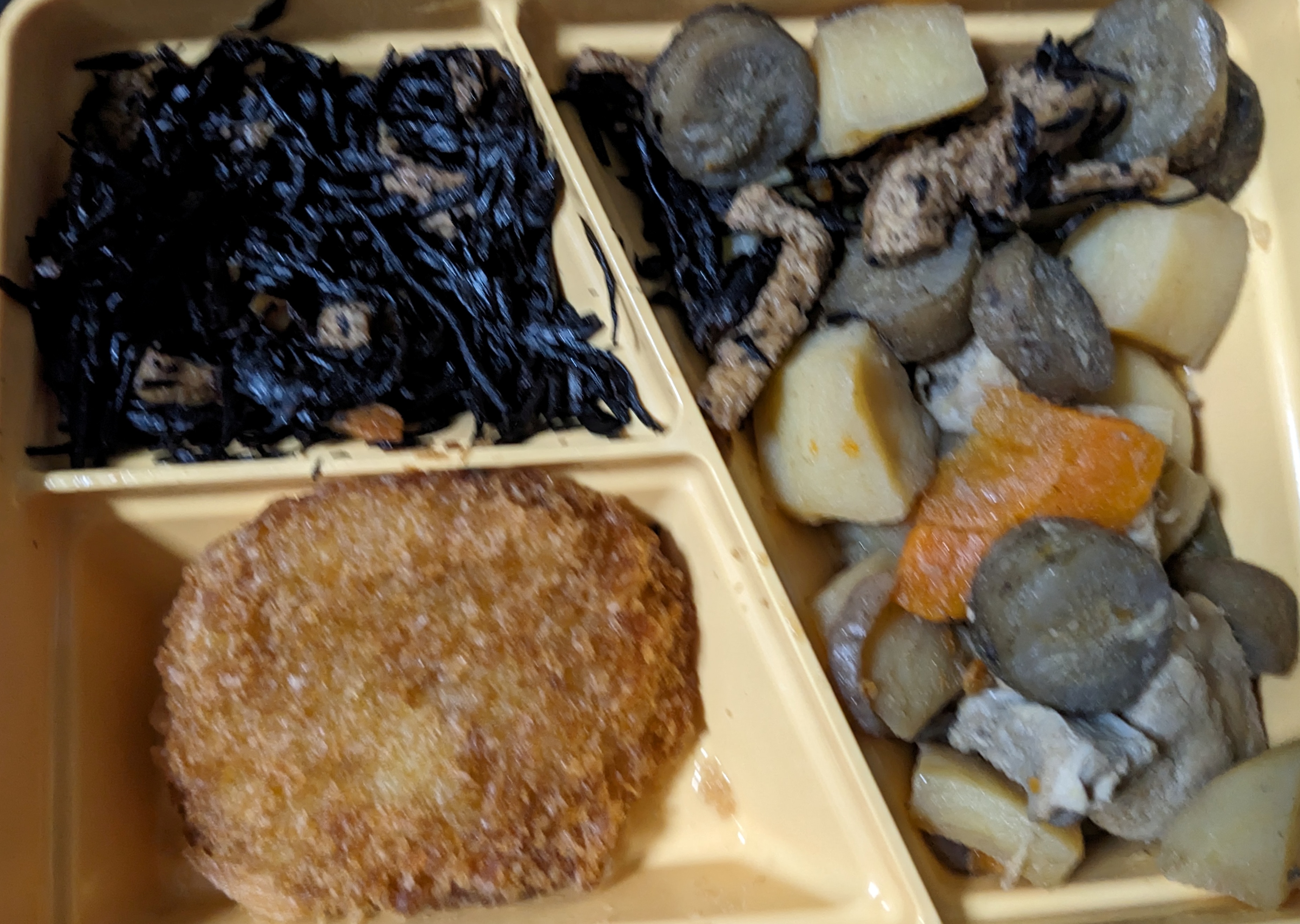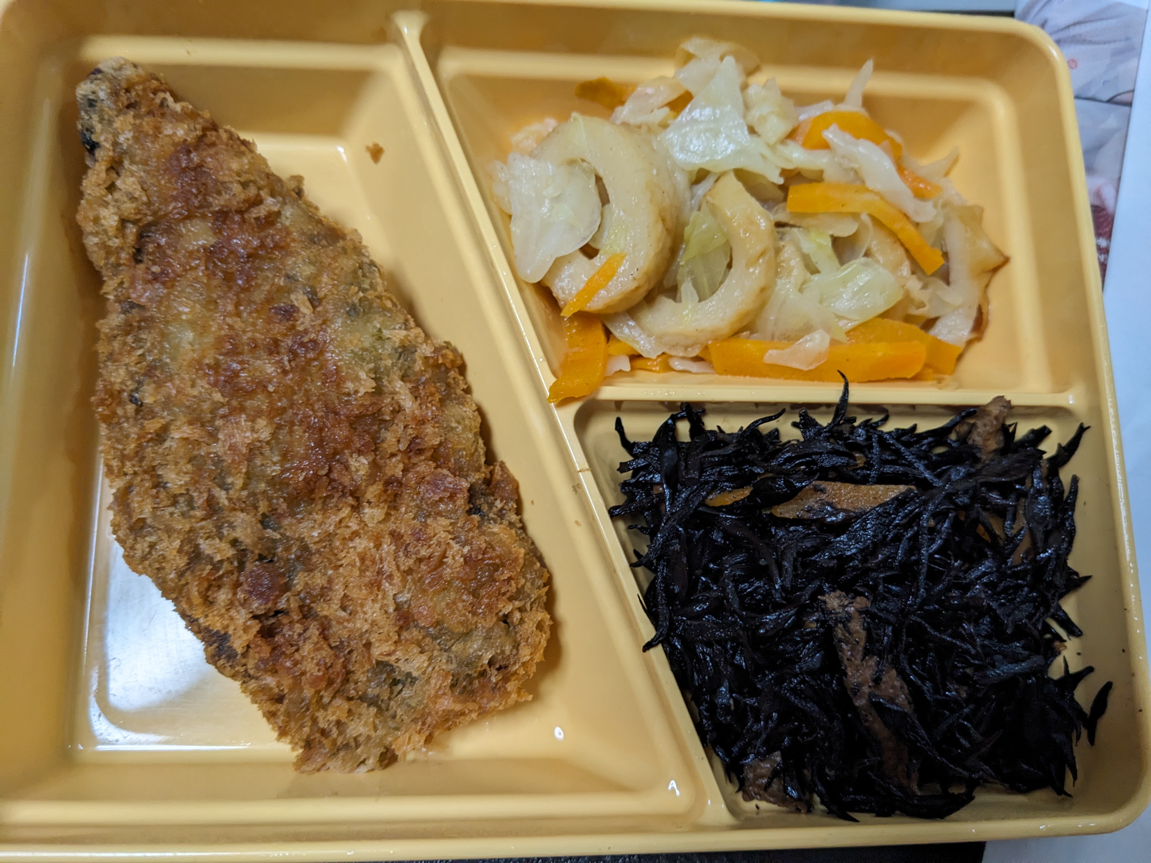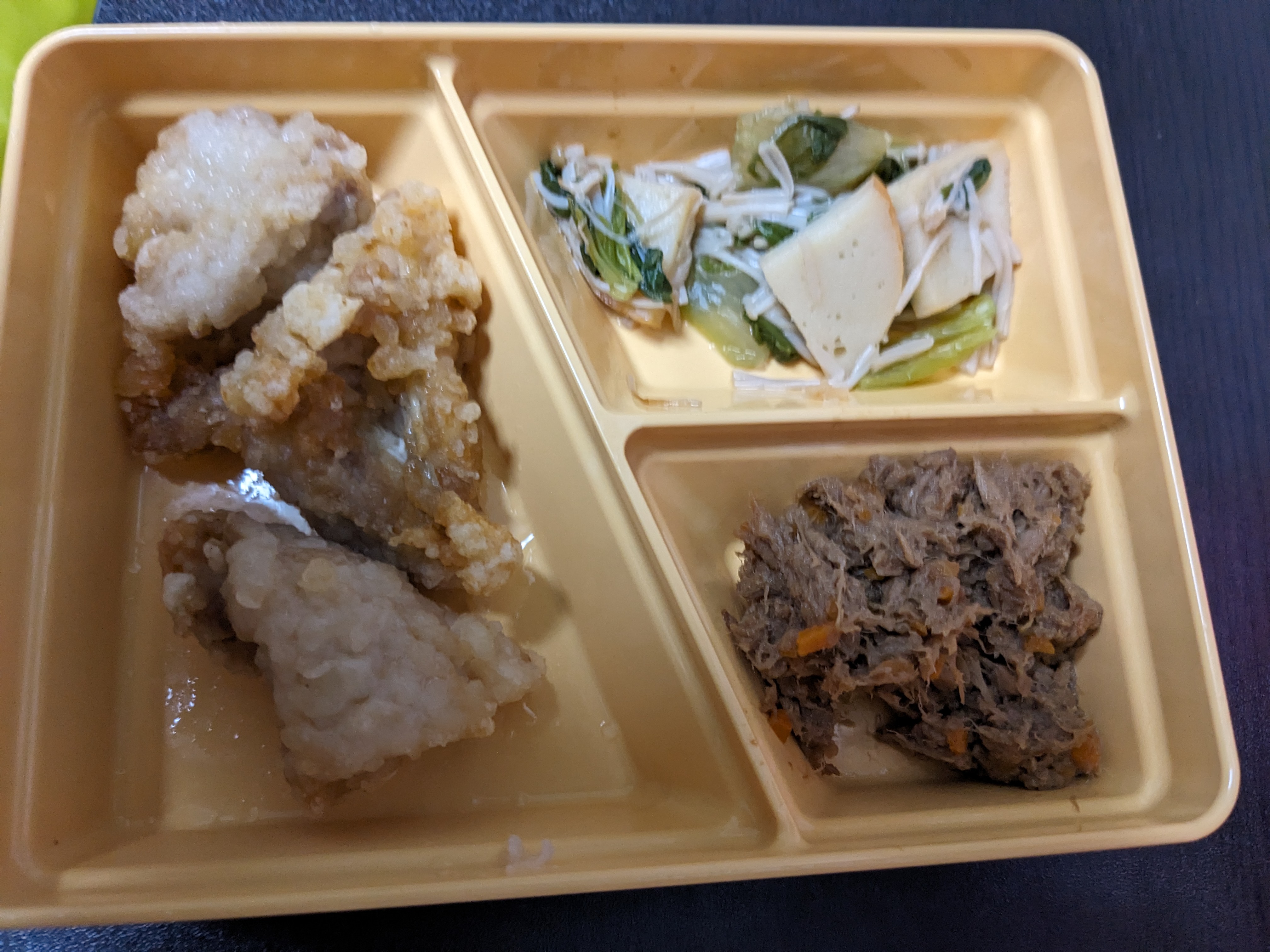 白ご飯・かき揚げ・豚肉とこんにゃくのみそ煮・鶏そぼろふりかけ・米粉めんわかめスープ・牛乳