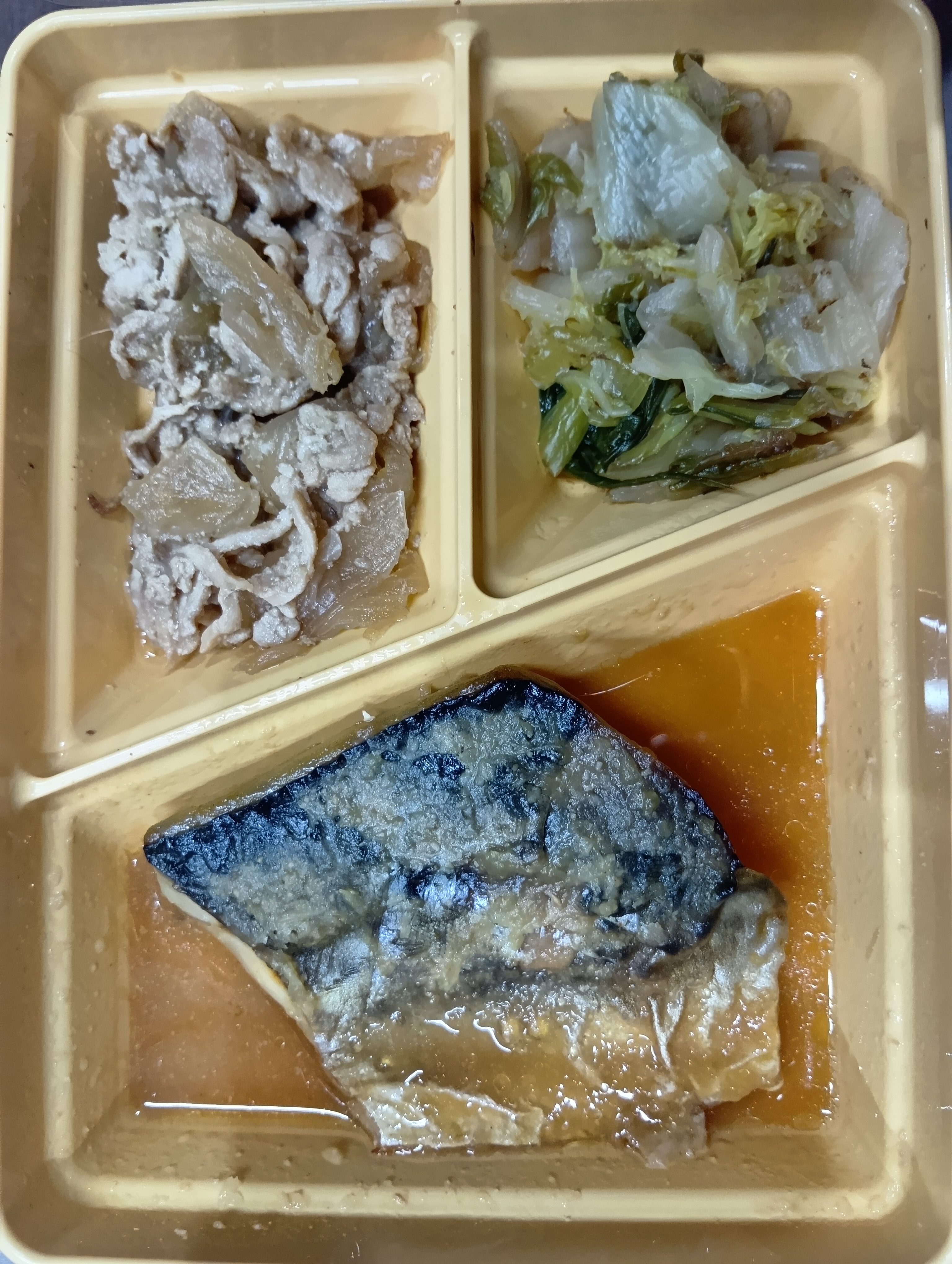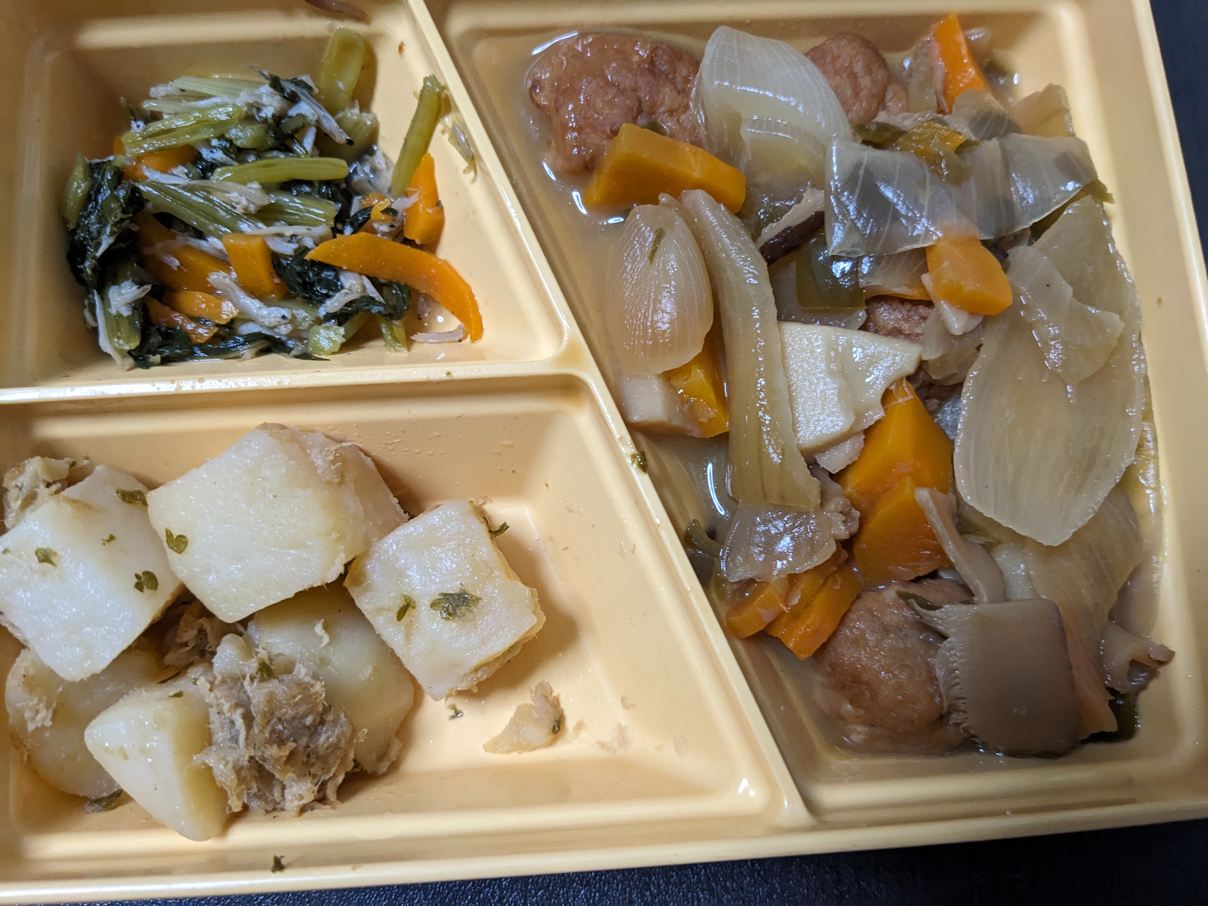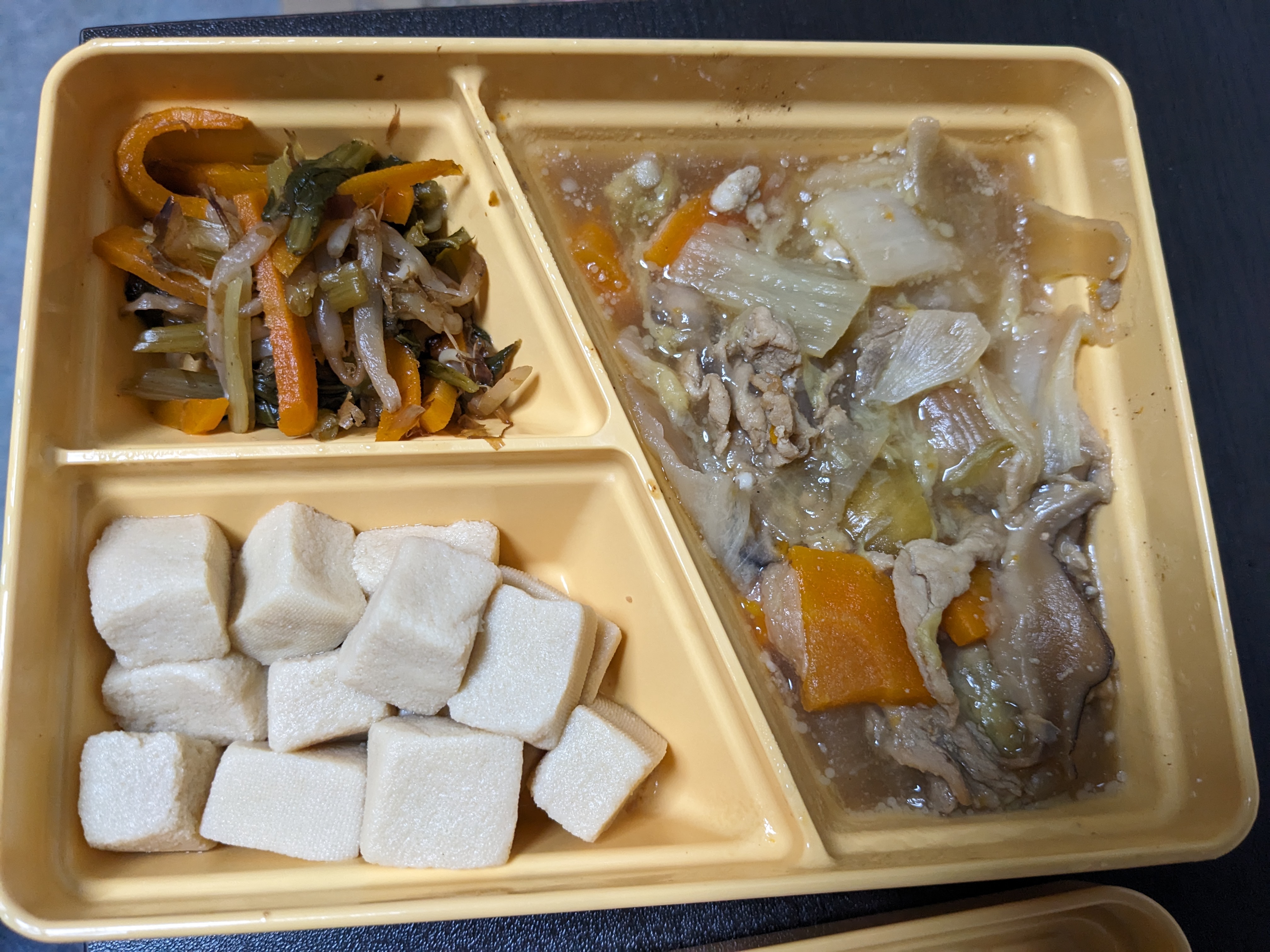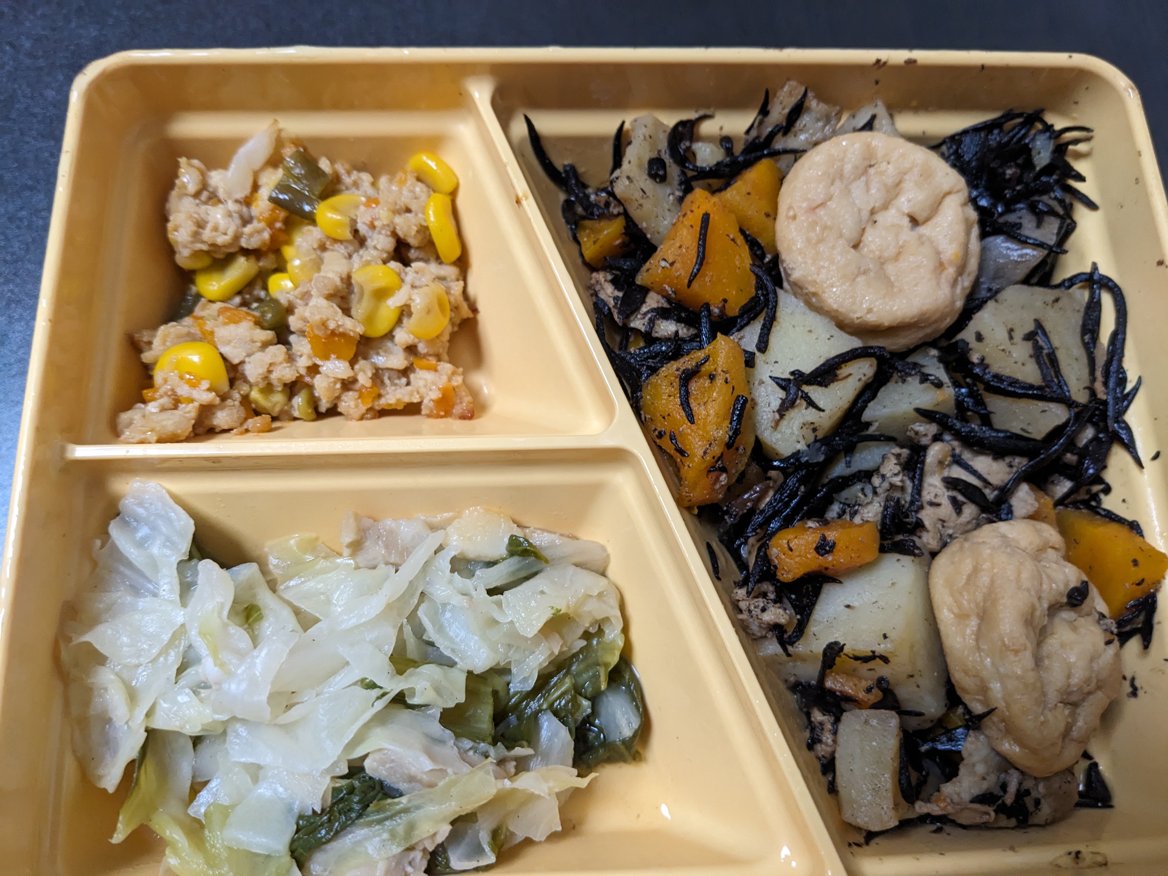 白ご飯・関東煮・豚肉とキャベツのみそ炒め。ひじきの煮物・牛乳