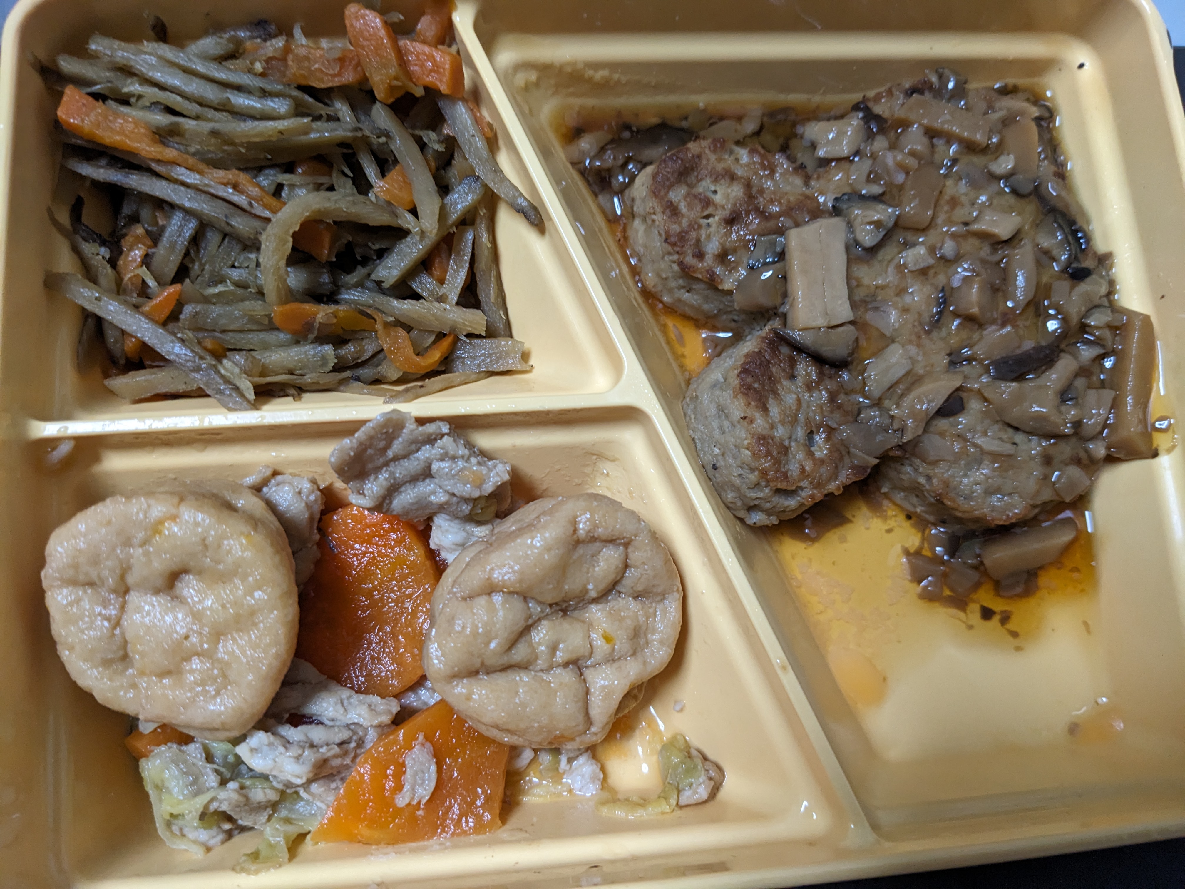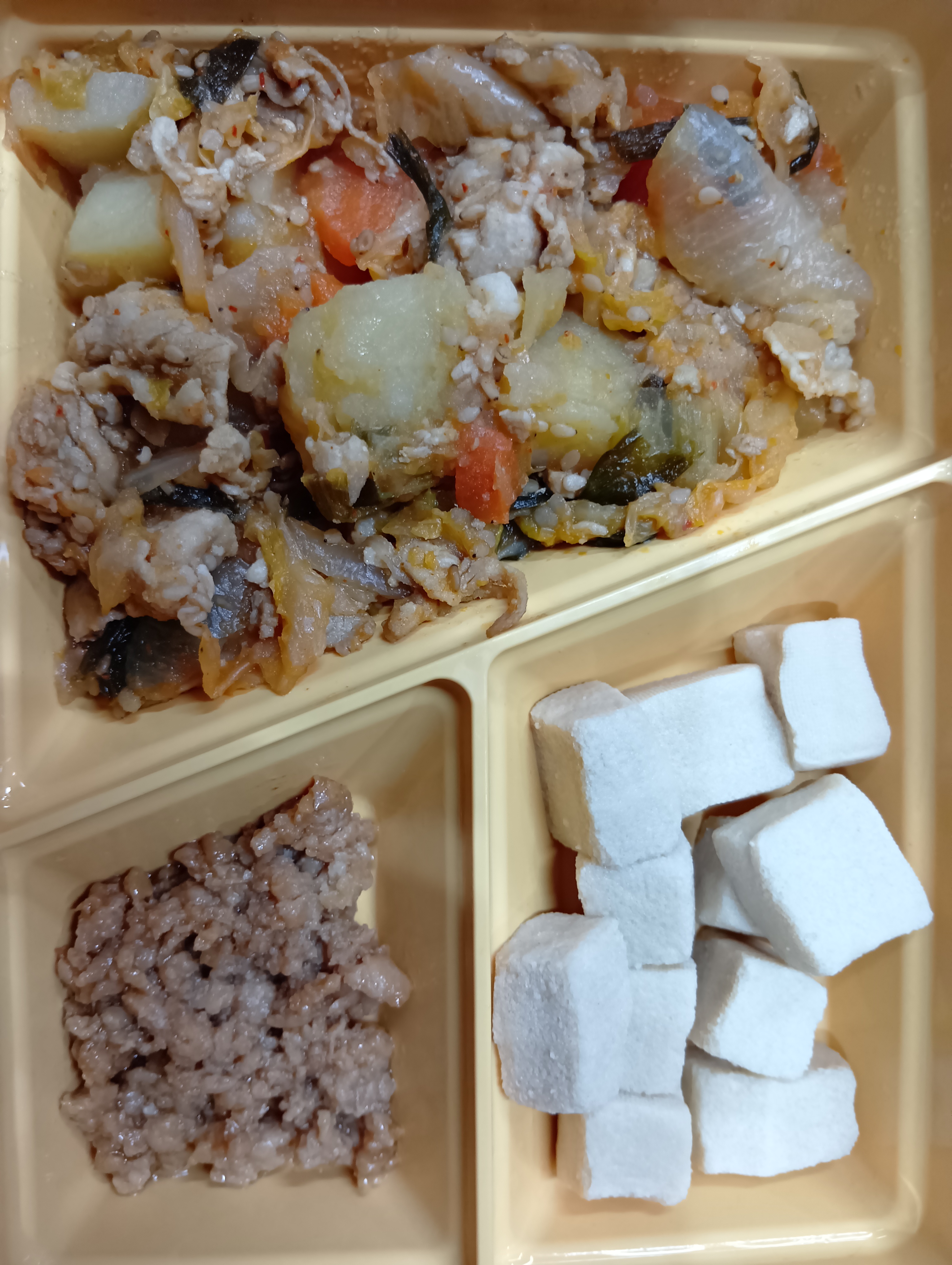 白ご飯・とりすき焼き風にこみ・豚キムチコロッケ・シーチキンのそぼろ煮・牛乳