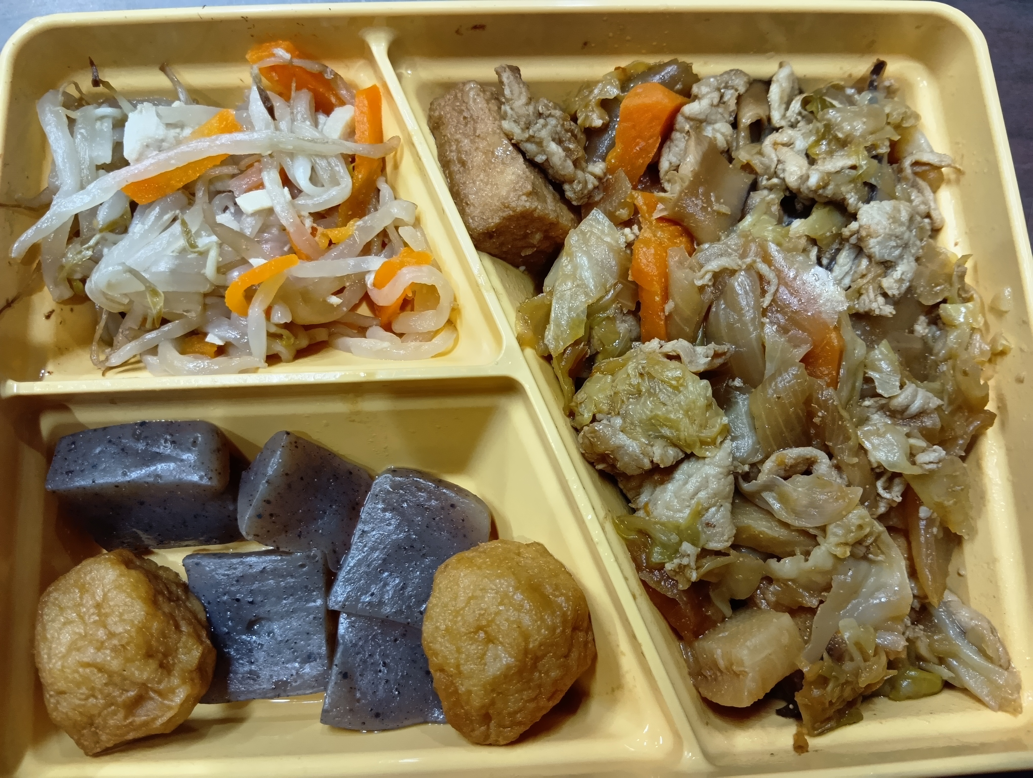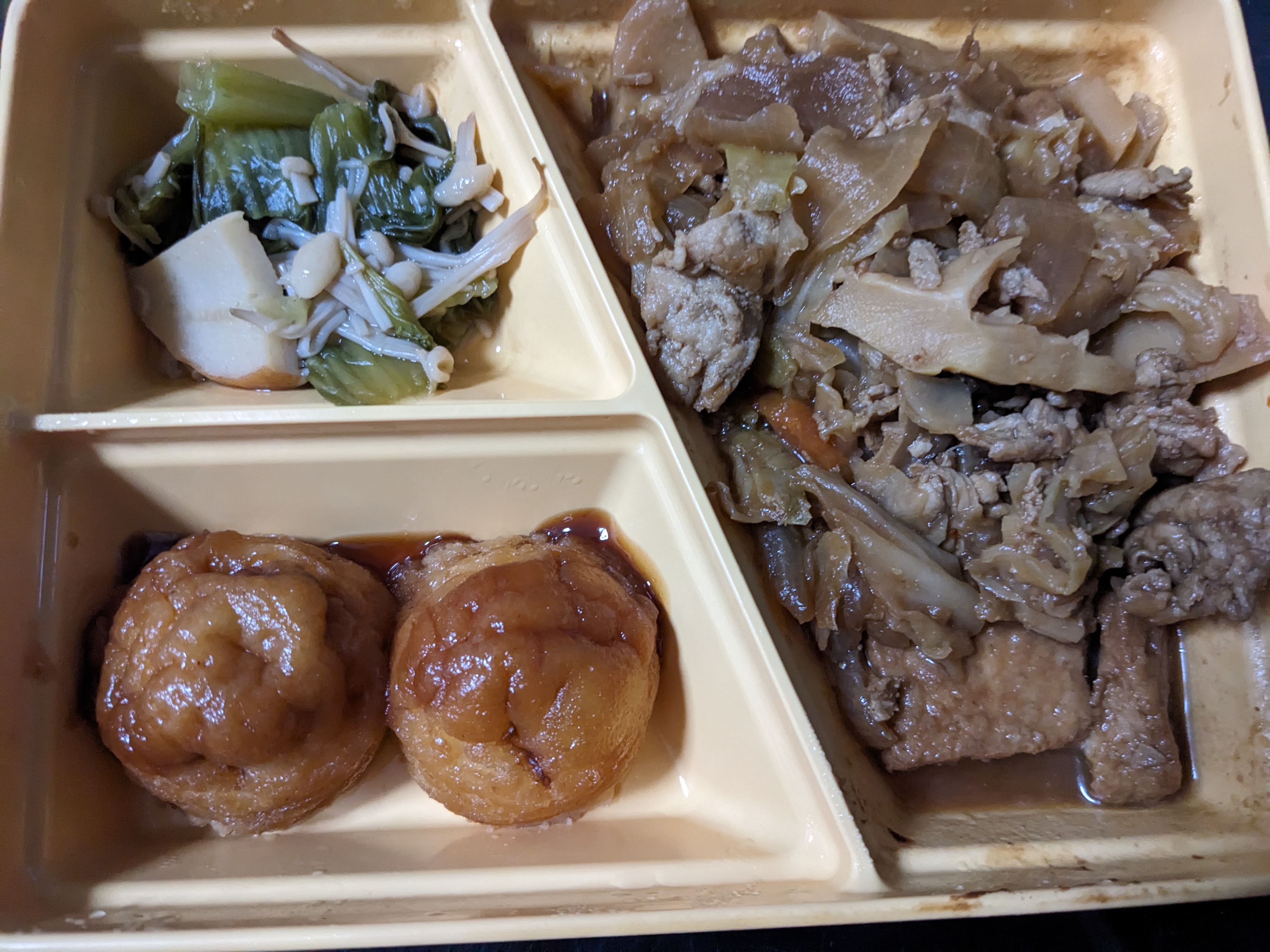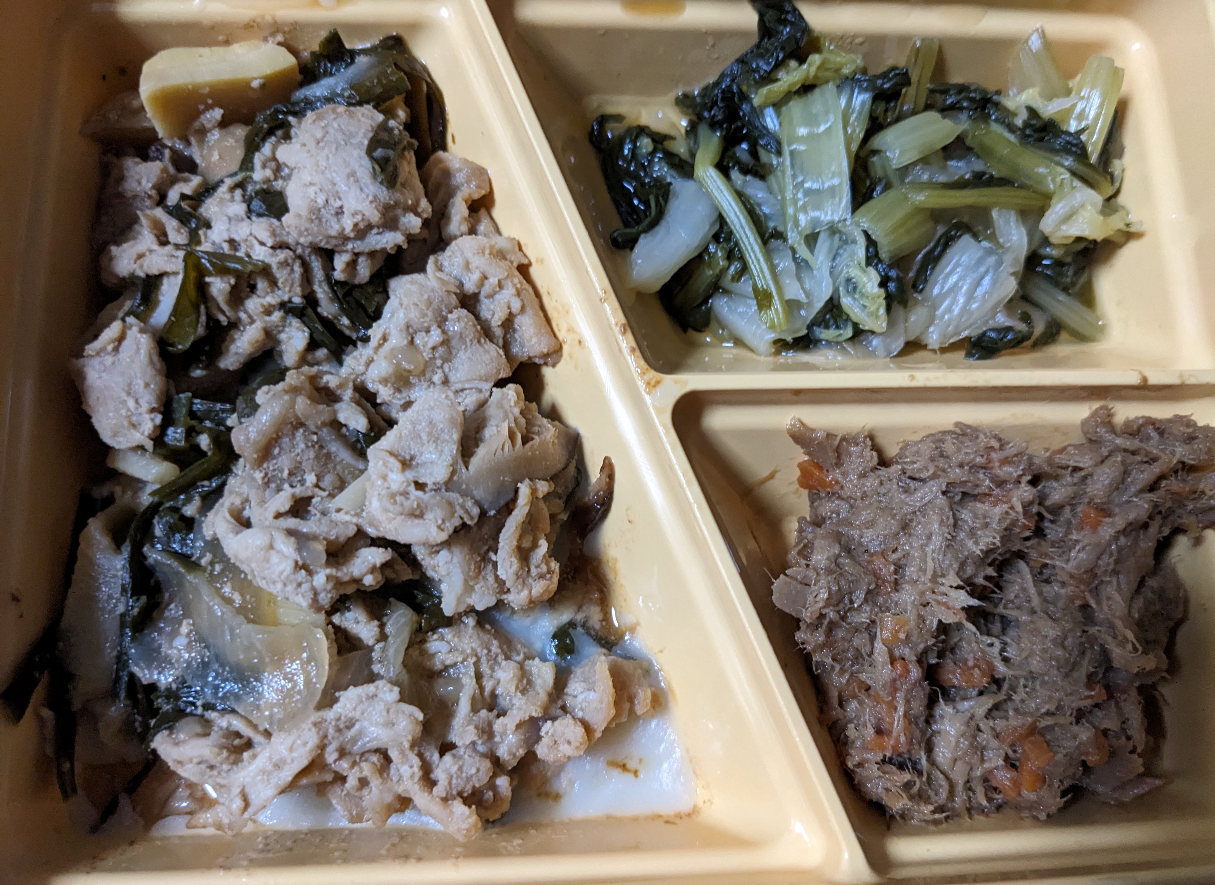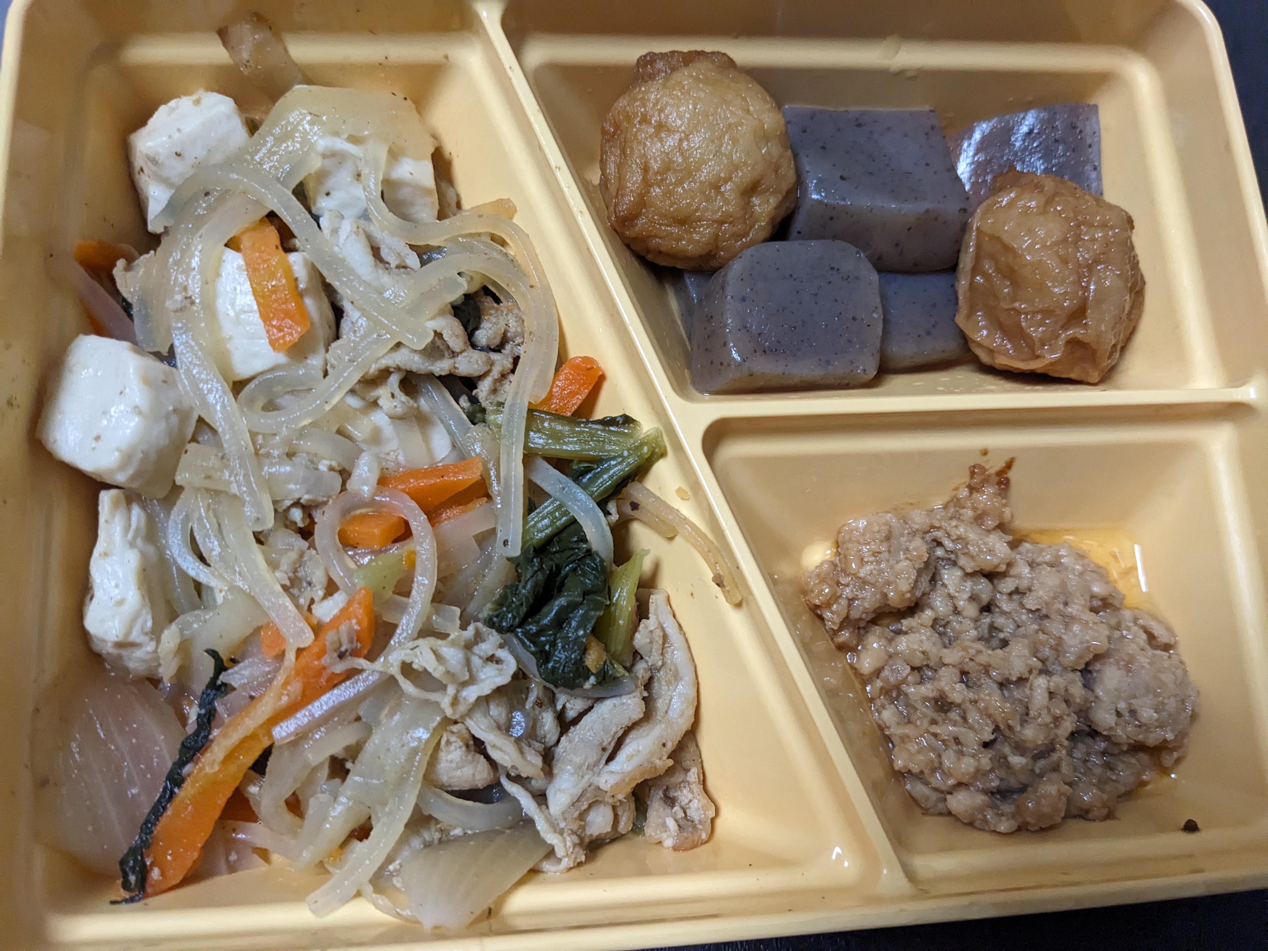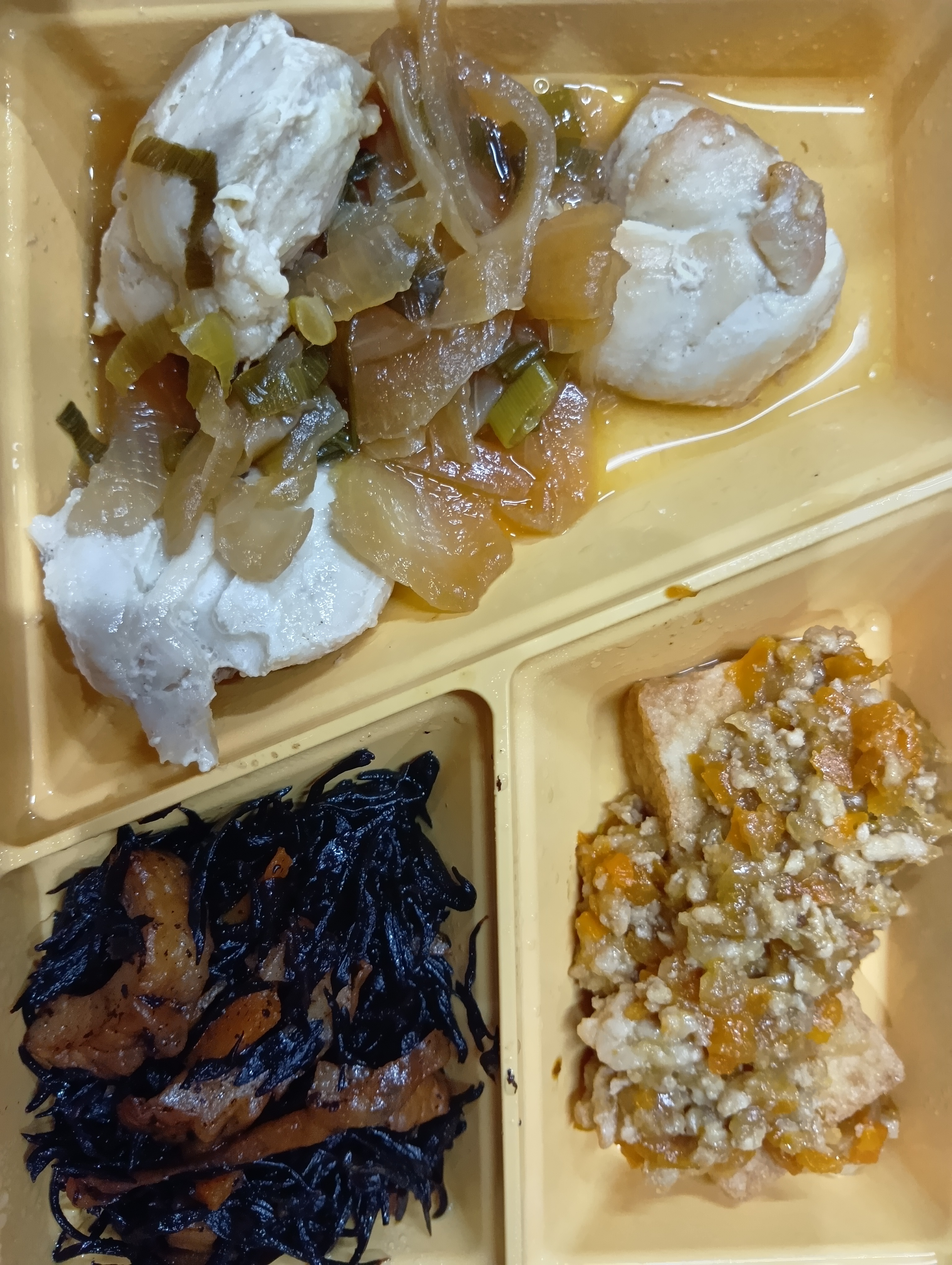 白ご飯・とりすき焼風にこみ・ちくわの天ぷら・ピリ辛高菜そぼろ・牛乳