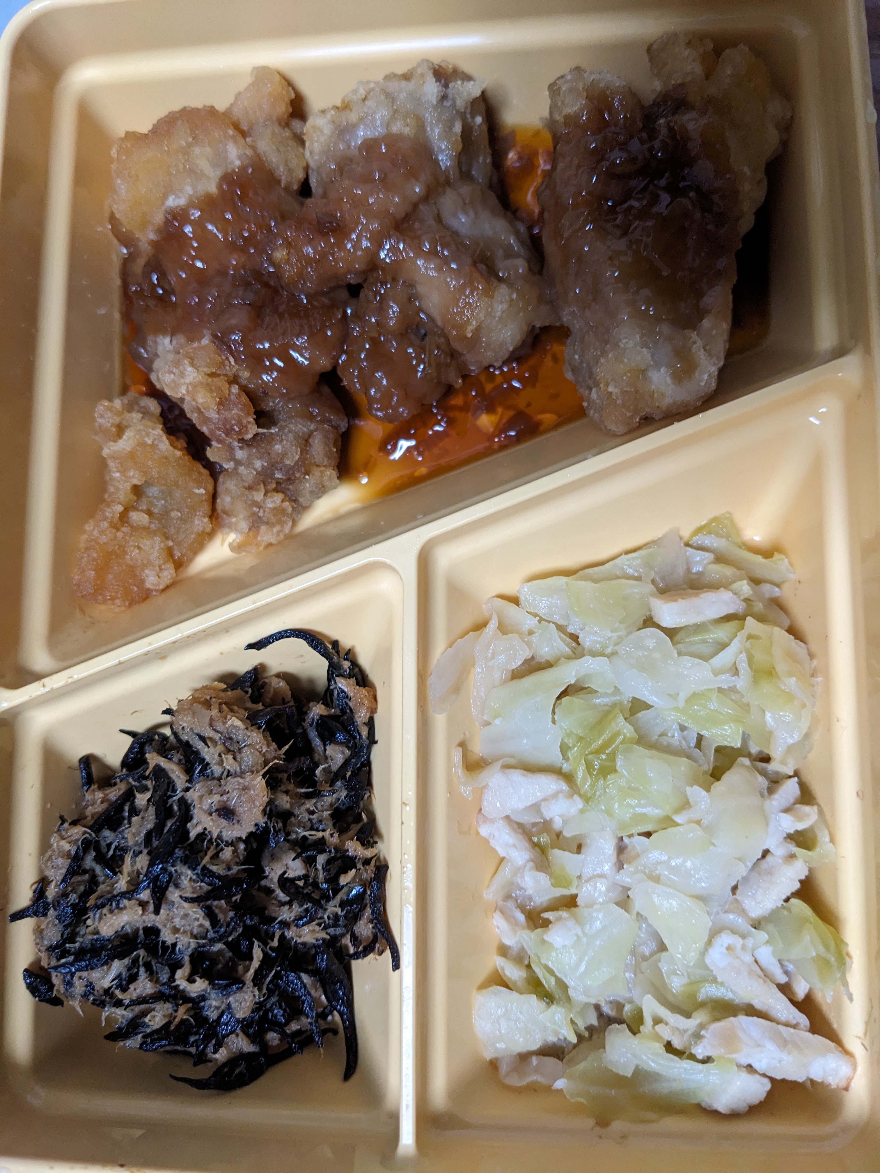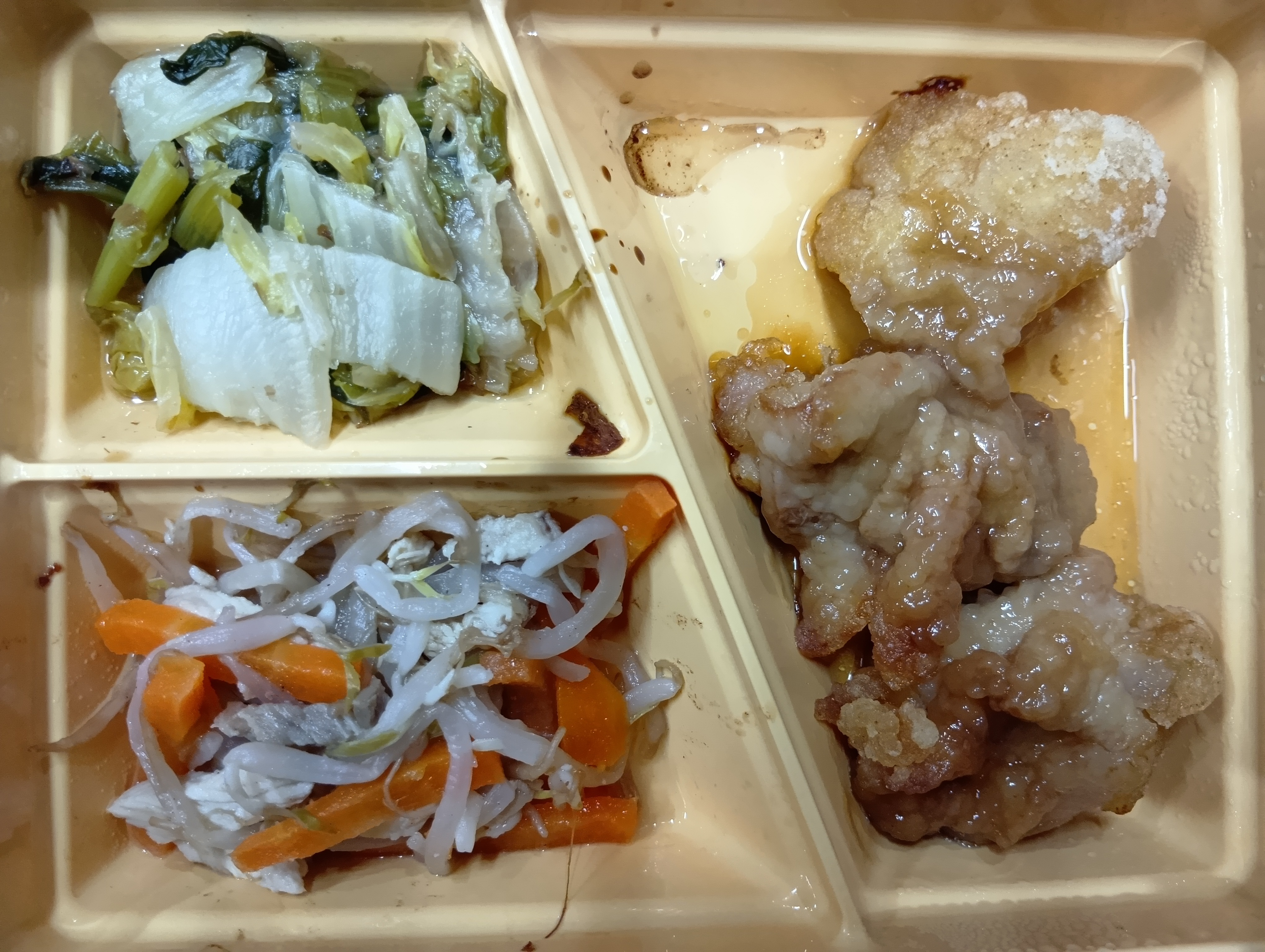 白ご飯・鶏肉の甘酢和え・小松菜のチャンプル・にんじんしらす・塩こんぶ・牛乳