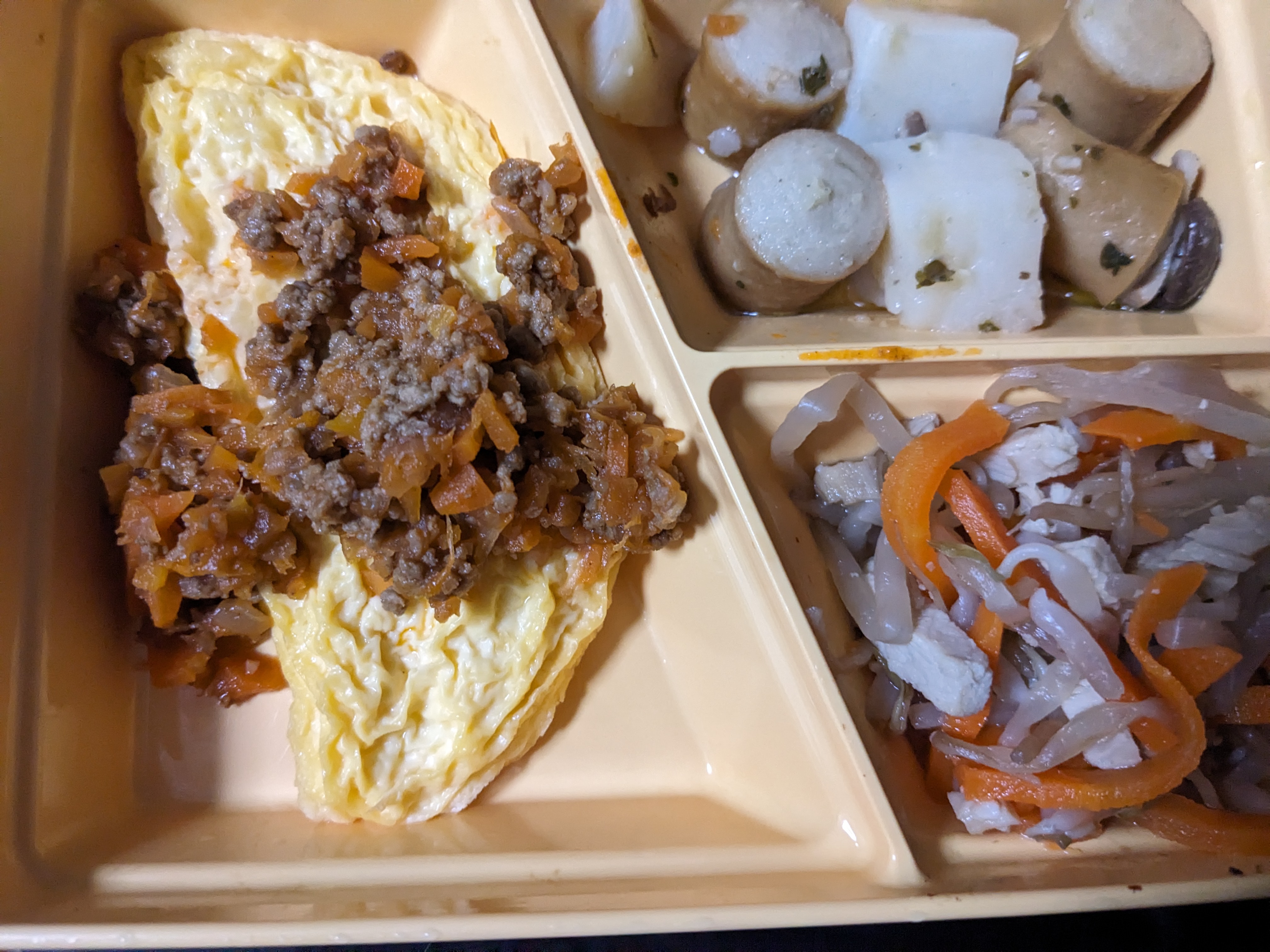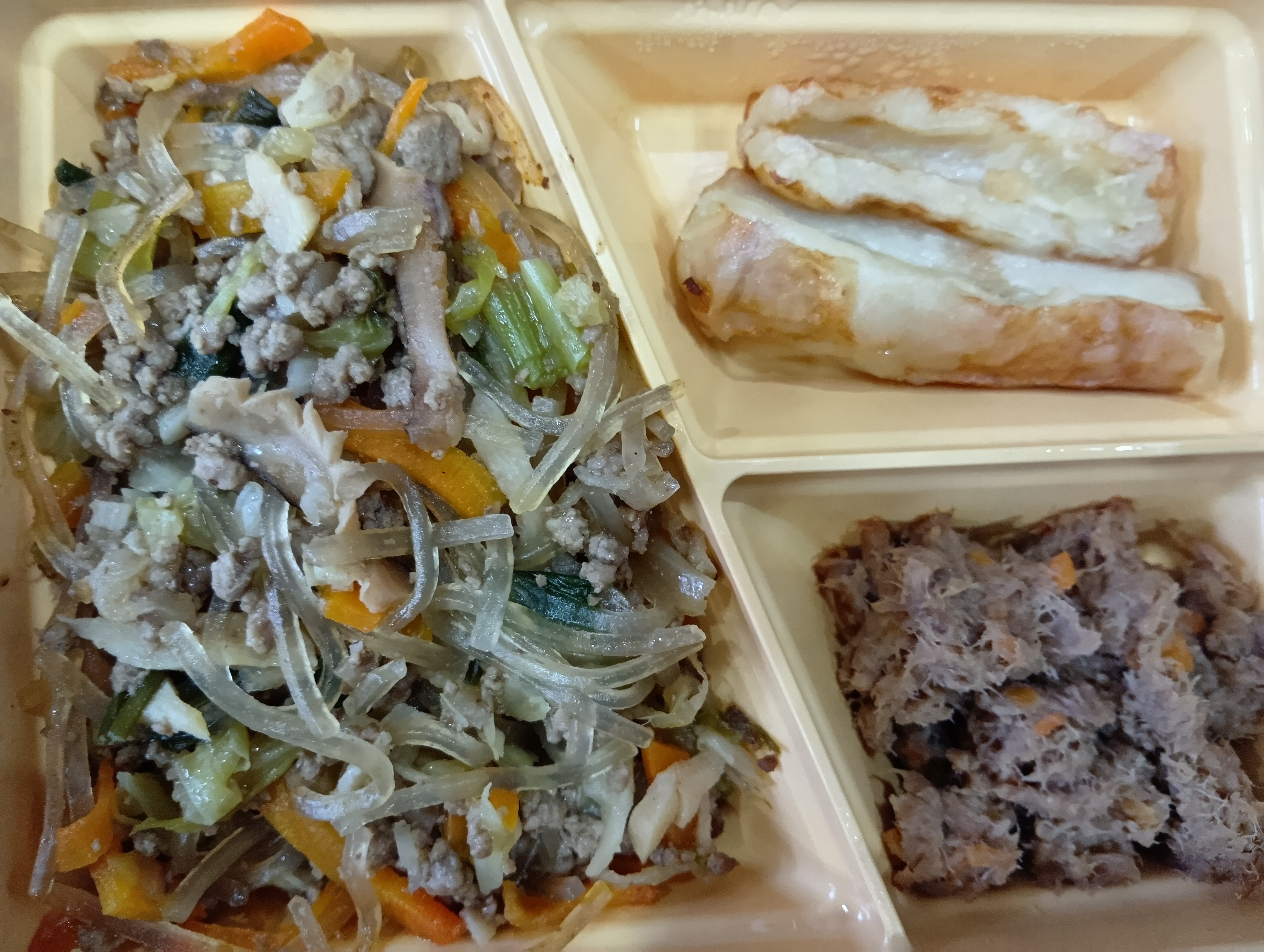 白ご飯・春雨のひき肉炒め・丸天の含め煮・ひじきの煮物・牛乳
