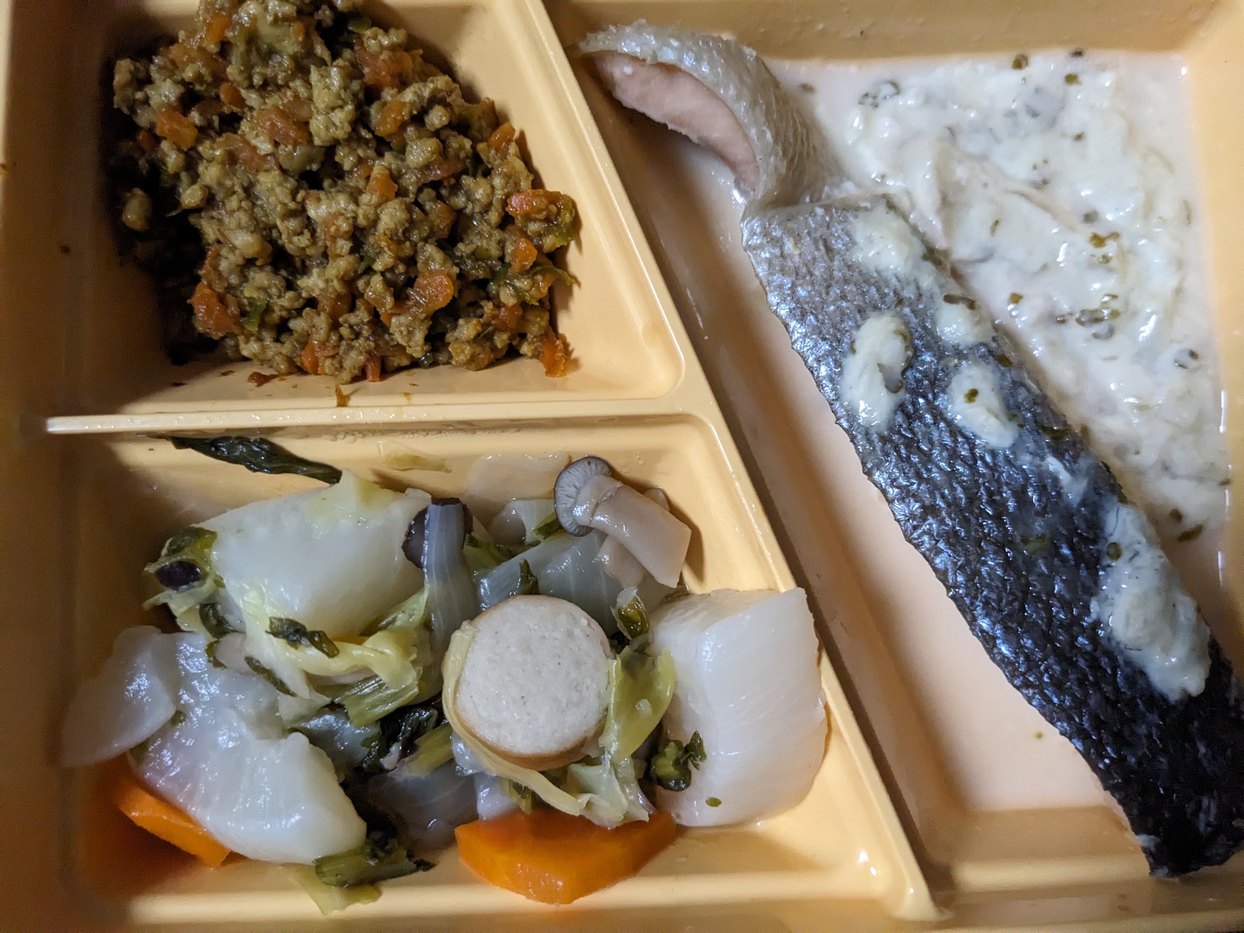 菜飯・・白身魚の野菜ソースかけ・豚ばらとじゃがいもの甘辛炒め・ひじきの煮物・牛乳