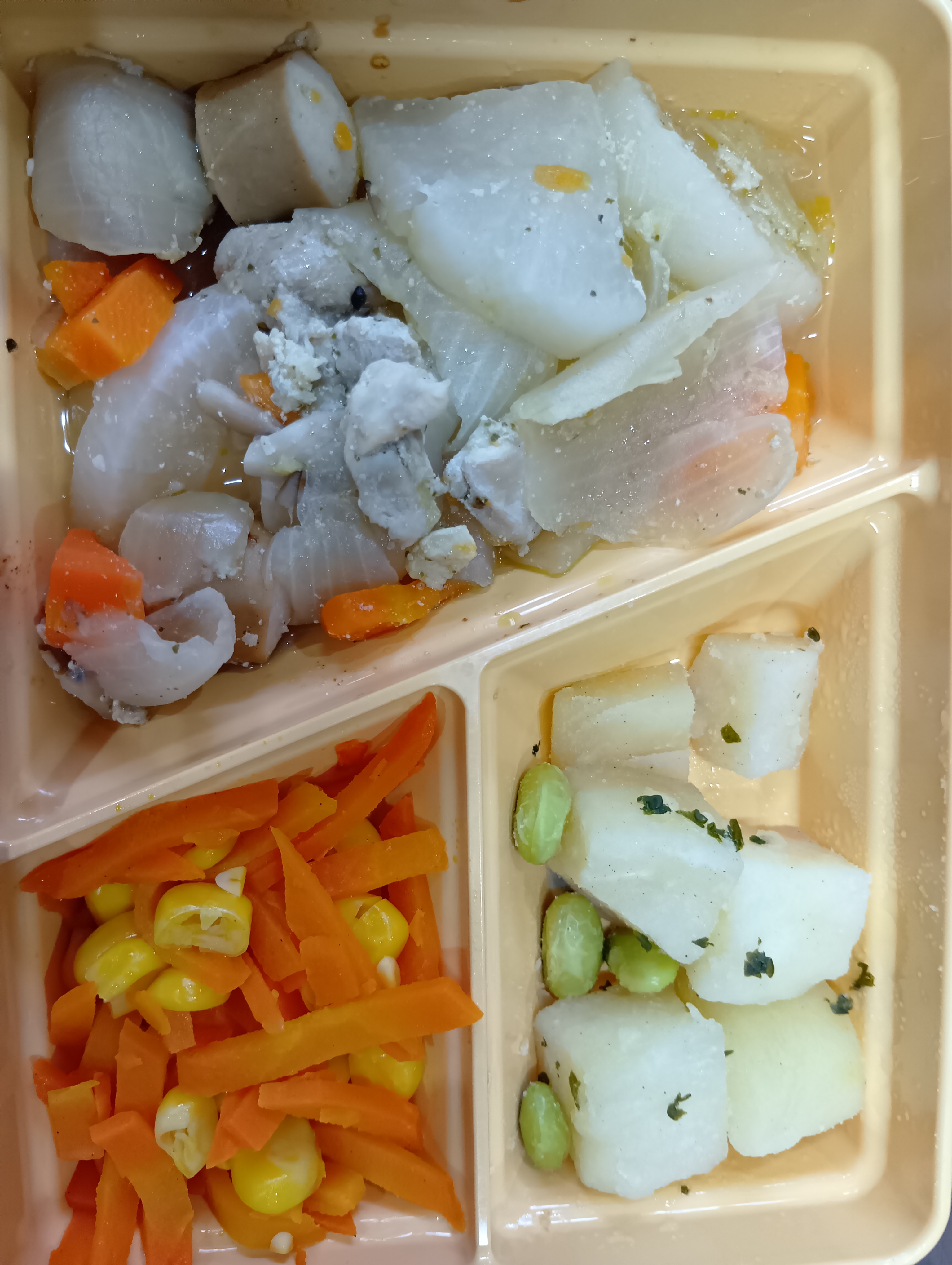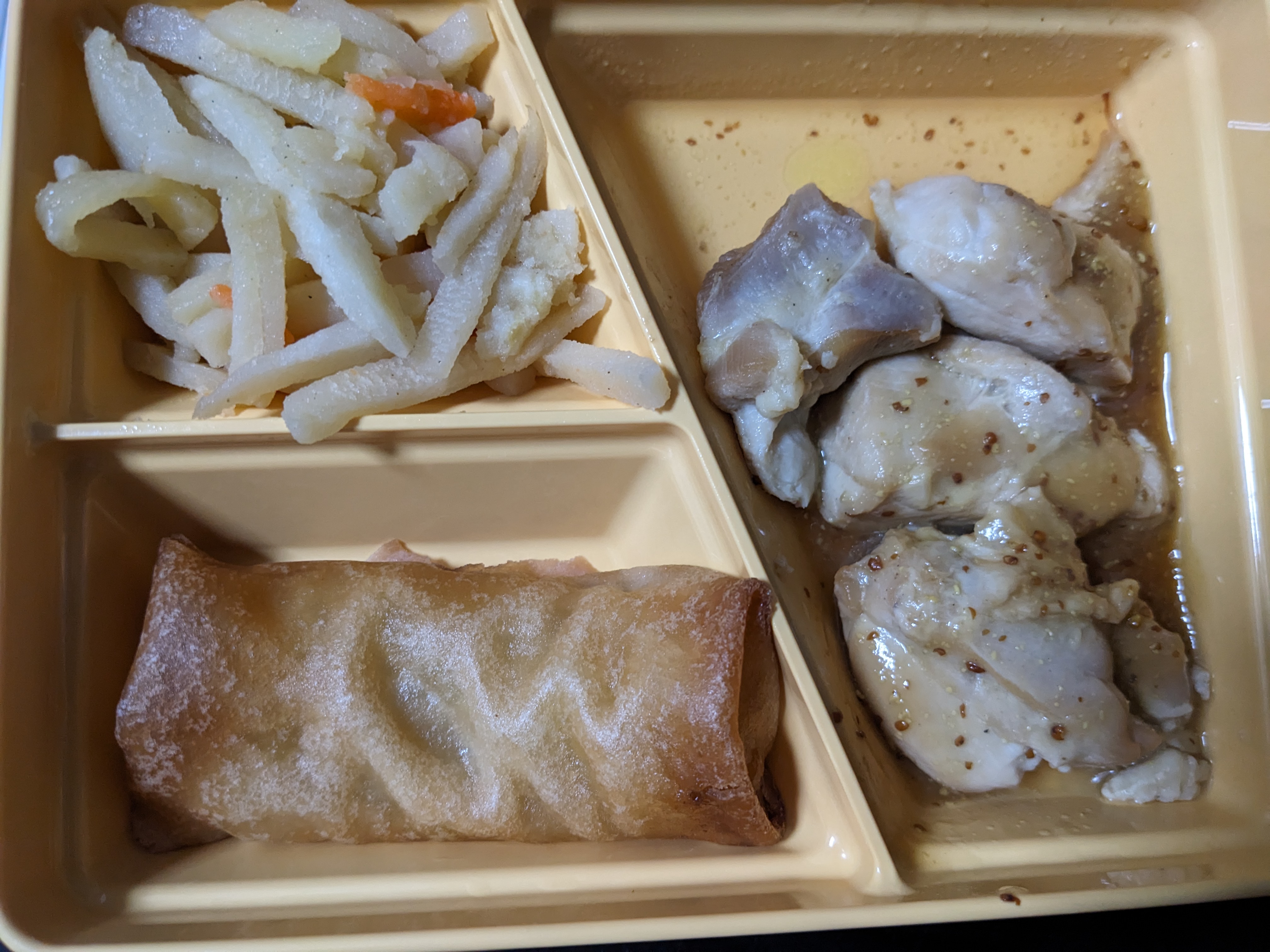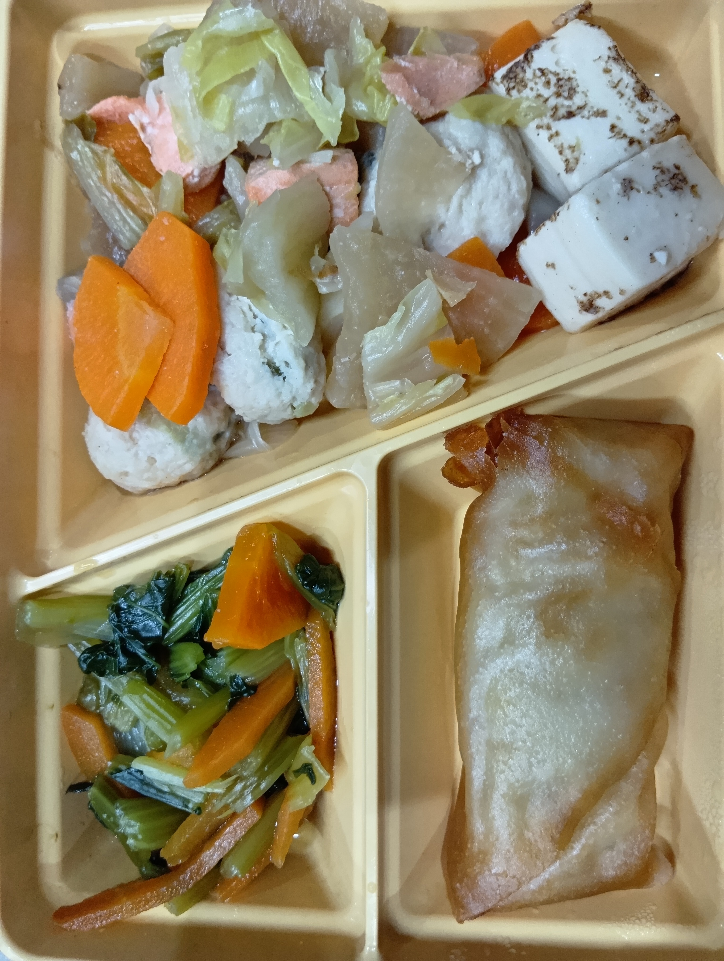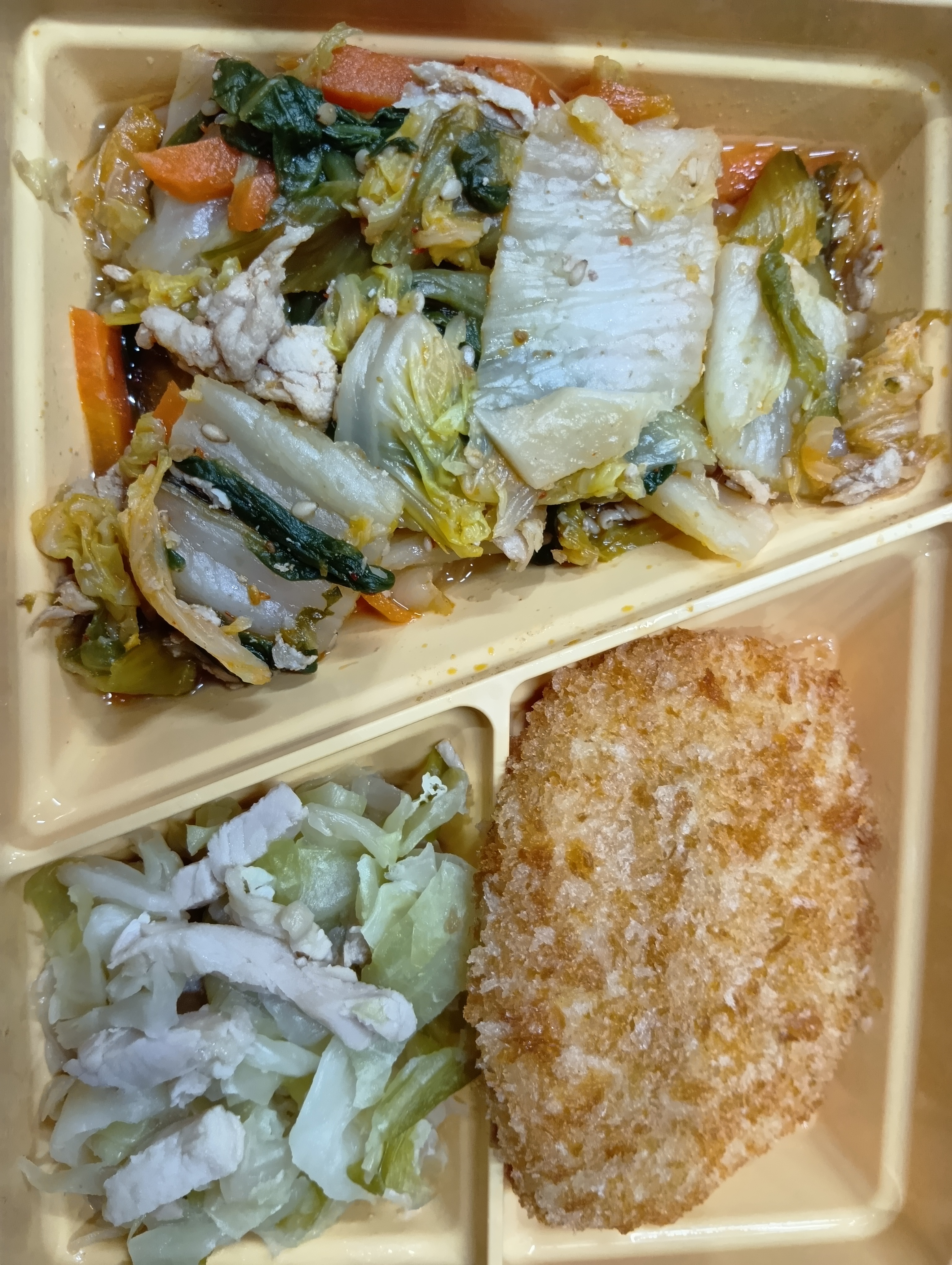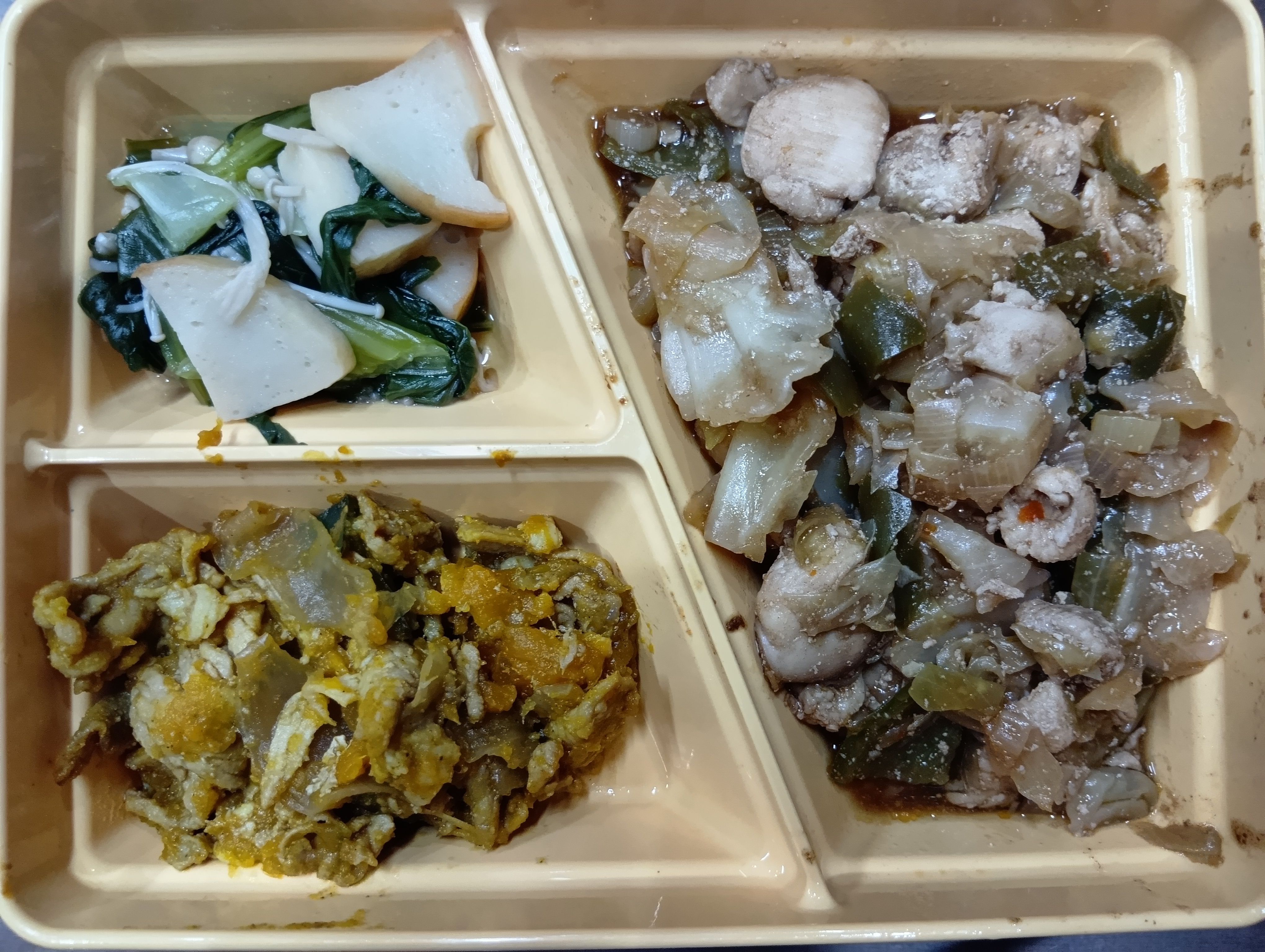 白ご飯・チキンカツ・チンゲン菜の炒め物・にんじんしりしり・カレーシチュー・牛乳