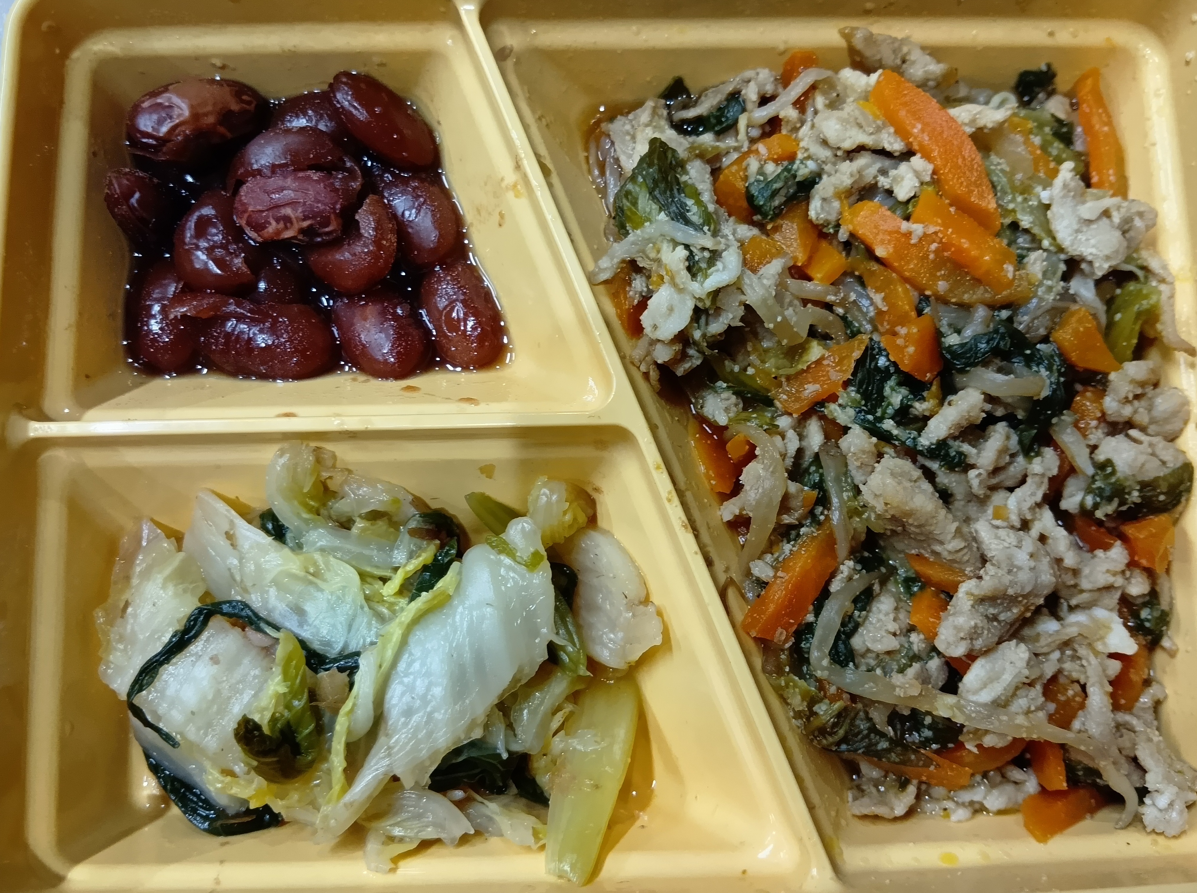 わかめご飯・豚肉のすき焼き風・切干大根のピリ辛炒め・金時豆の煮物・牛乳