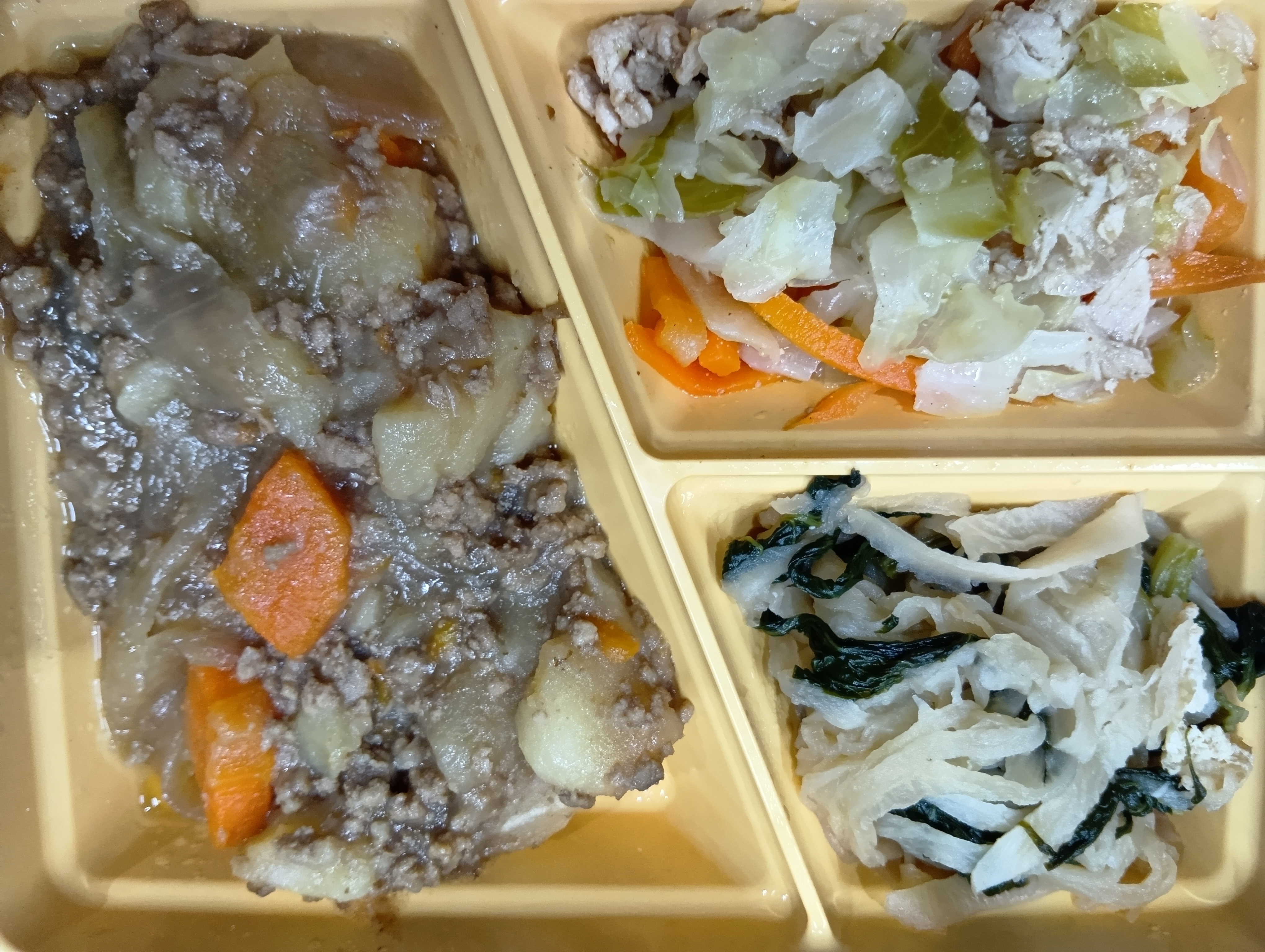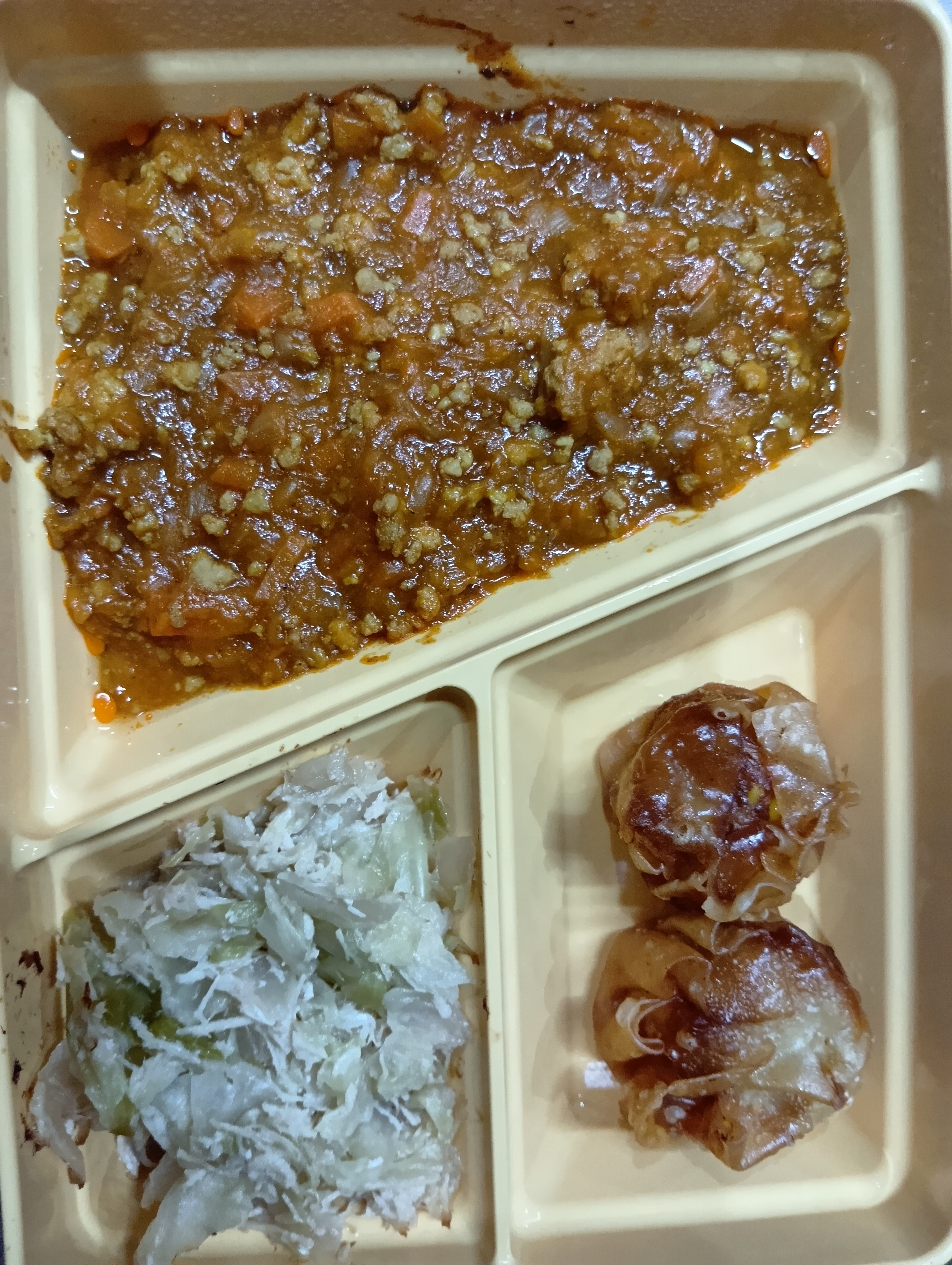 白ご飯・ドライカレー・ポテトコロッケ・チンゲン菜とツナの炒め物・ミルメーク・牛乳