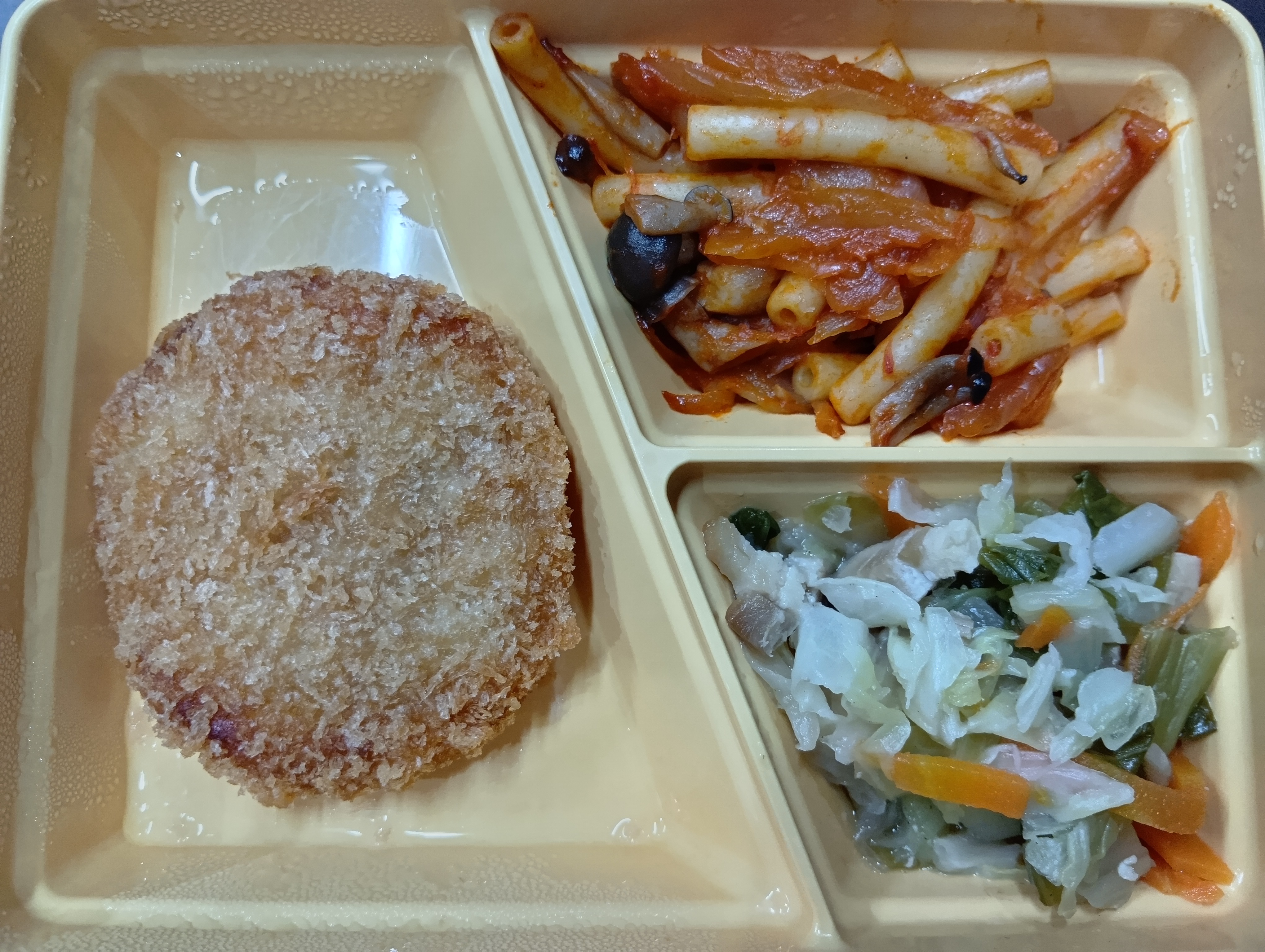 白ご飯・ハンバーグ野菜ソースかけ・バジルスパゲティ・野菜炒め・牛乳