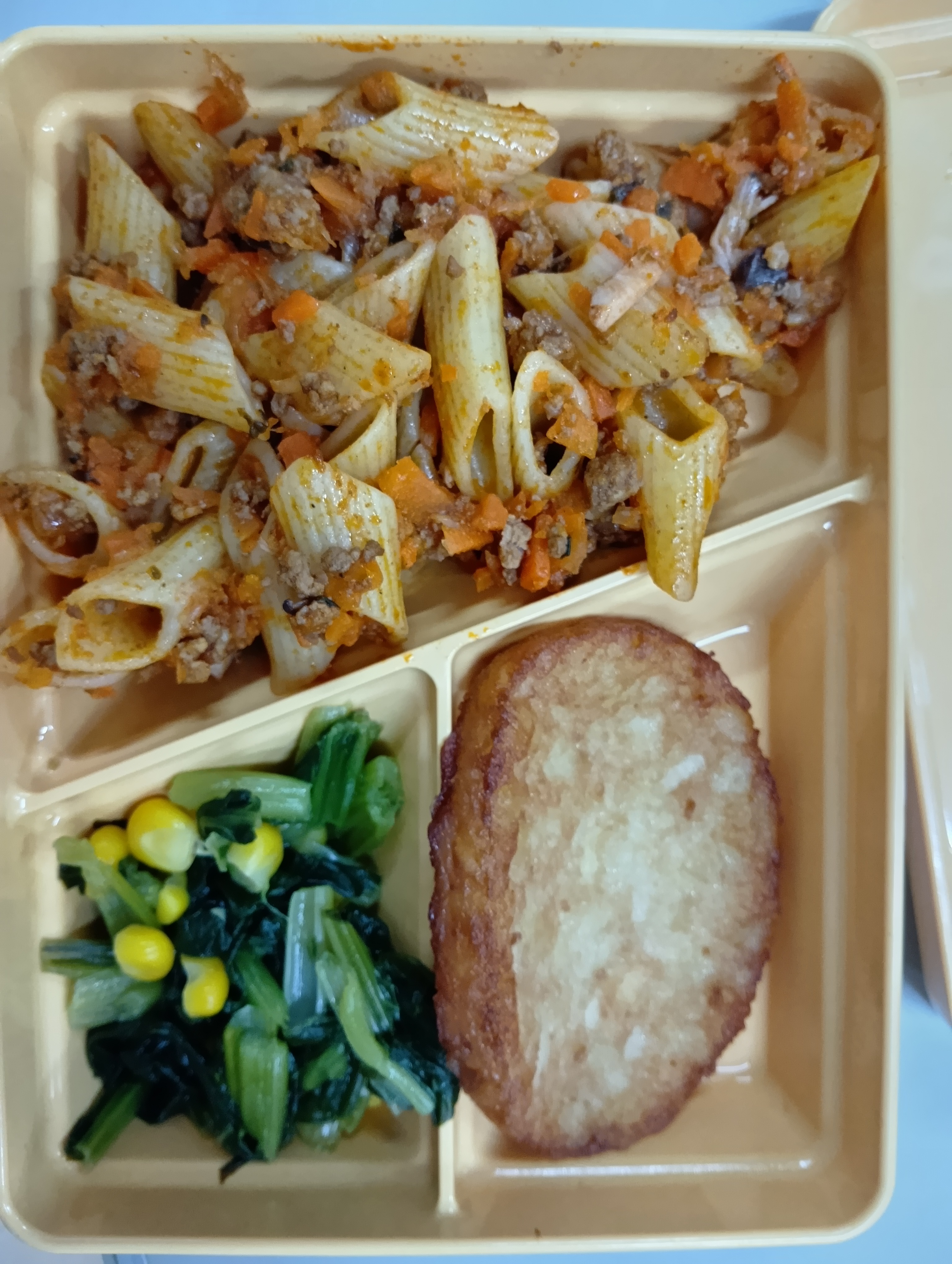黒糖パン・ミートペンネ・ジャーマンポテト・ほうれん草のサラダ・ミルメーク・牛乳