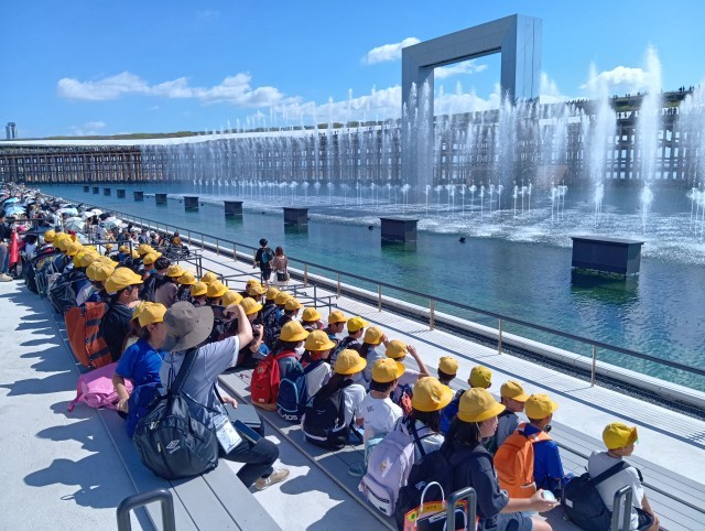 ウォータープラザで音楽に合わせた噴水ショーを見て、