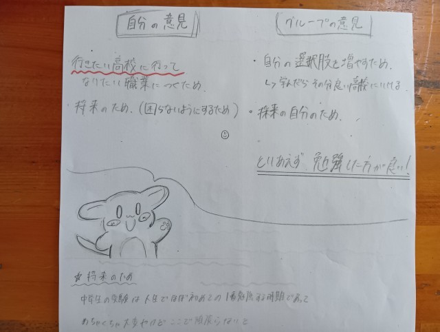 中学校3年生が書いた「なぜ勉強が大切なのか」というプリントを見ながら、