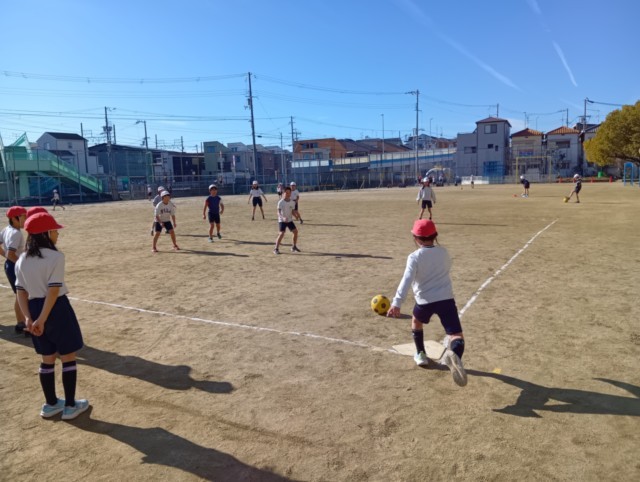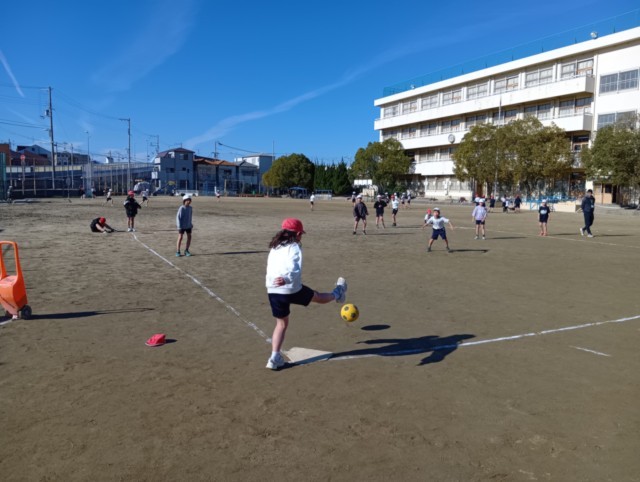 4年生が、学年合同でキックベースボールをしていました。
