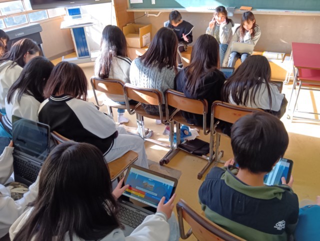 隣のクラスでは、タブレットを使って出し物のお題に取り組んでいました。