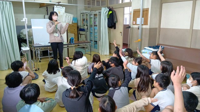 計測する前に、保健室の先生から「骨の伸び方」と「睡眠の大切さ」について話をしました。