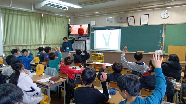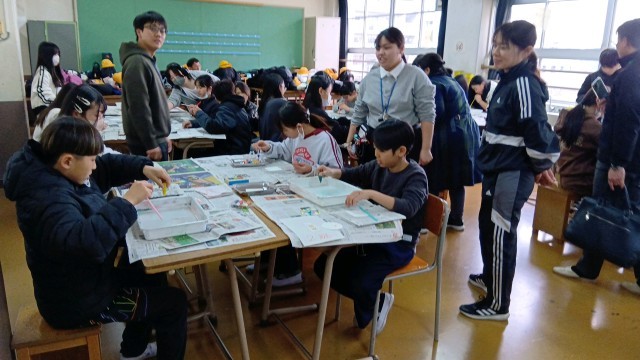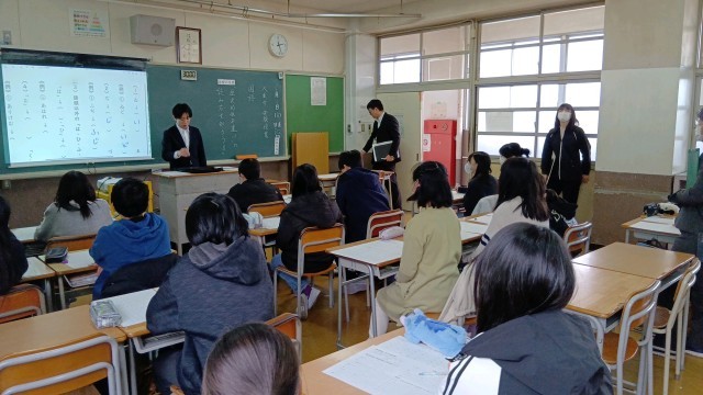 最初は、4つの教室に分かれて、中学校の授業体験です。