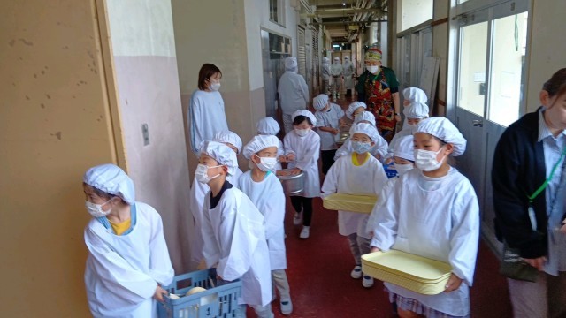 給食室前で「いただきます!」と元気なあいさつをして、教室まで運んでいきました。