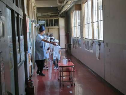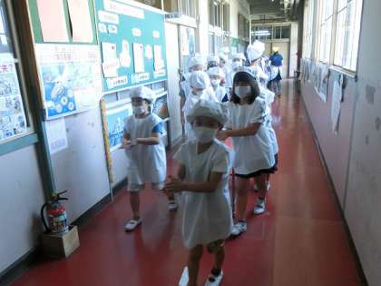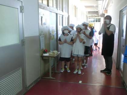 給食当番の子どもたちは、給食室に担任の先生といっしょにいきますが、いつもと違うのは担任の先生が三角巾をしているところです。