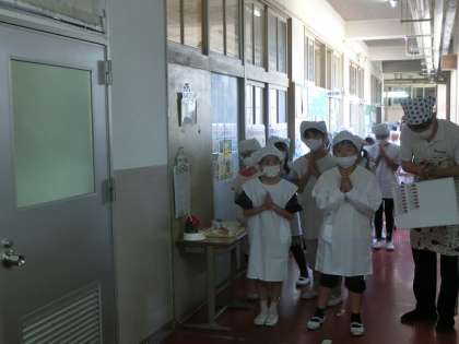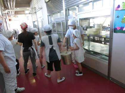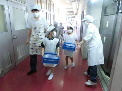 静かに並んで、すばやく給食の食材を運んでいきました。