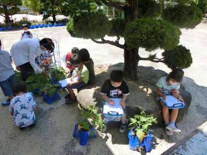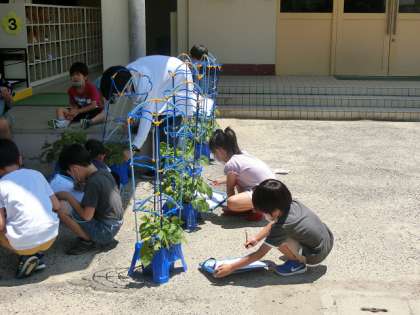 1年生は、午前中で帰宅しましたが、午前中に「あさがお」の観察をしました。
