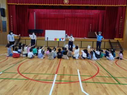 交通安全協会(こうつうあんぜんきょうかい)の方が、しっかり前(まえ)をむいて きいていた1ねんせいを ほめていました。