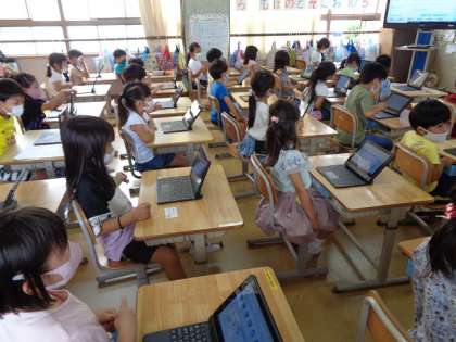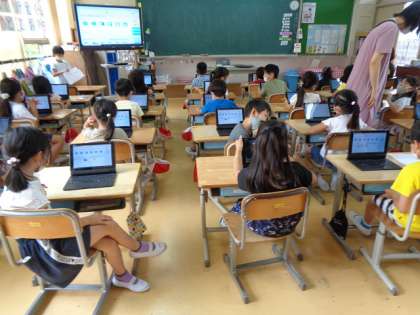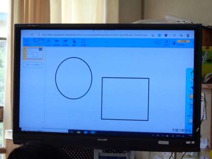 タブレットを つかって、まなびポケットの 「skyメニュー」を 出していました。