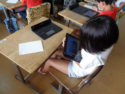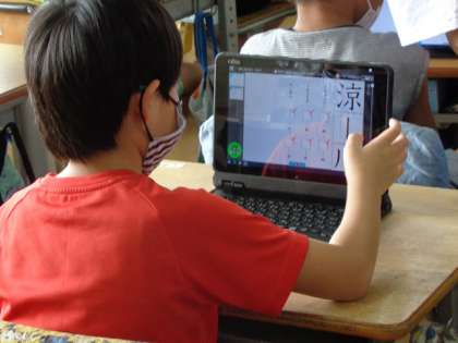 タブレットを つかって、かん字の れんしゅうを していました。