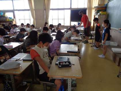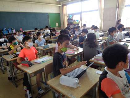 写真は、朝のあいさつの前の検温記録(タブレットにて全学年でおこなっています)と朝のあいさつです。