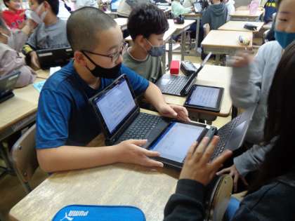 それぞれの作詞を、タブレットで見せ合いながら、まとめていました。