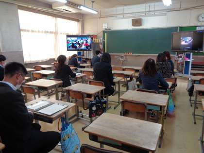 教師は、密になるのを少しでも防ぐために、順番に別教室でモニター参観しました。
