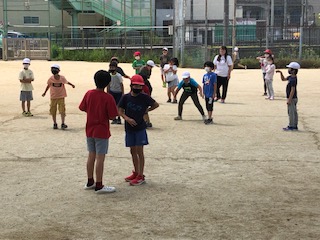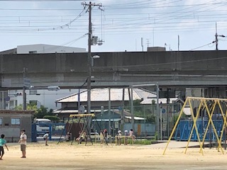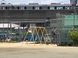 中休みの運動場では、先生とドッヂボール、ブランコ、鉄輪と賑やかです♪