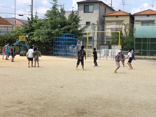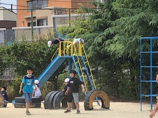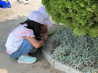 中休みの運動場、異なるドッヂボールのグループや、滑り台も人気です。草木のそばでは、何やら一心に見つめる2人が…、ダンゴムシでしょうか♪