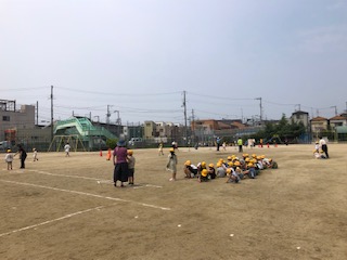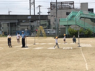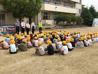 1年生は、警察と交通安全協会の方々が来て、通りを安全に歩く学習「交通安全教室」が開かれました。運動場に道路や信号、横断歩道が作られ、一人ひとりが安全に歩きます。横断歩道では、みんな手を上げて渡りました。