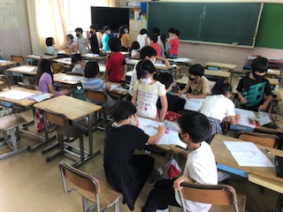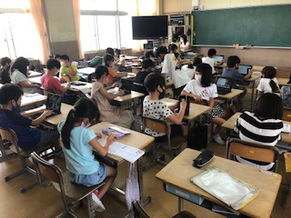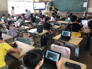 3年生の教室です。1クラスは国語の漢字ドリルに取組み、終わった人からタブレットタイムです。1クラスはタブレットで写真を撮ることを学んでいます。気がつくと、目の前の児童のタブレットは自撮り方向に向いていました。
