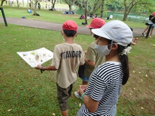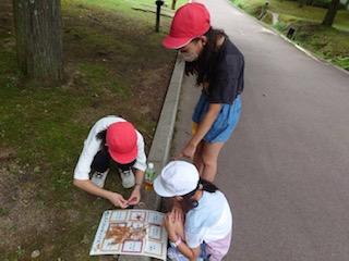 オリエンテーリング、うまく協力してミッションクリアしてるでしょうか。地面に置いたり、見ながら歩いたり、真剣かつ楽しそうです♪