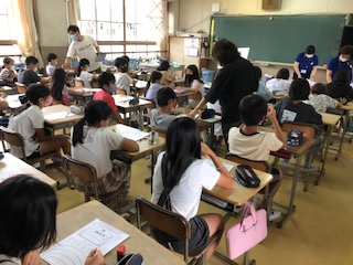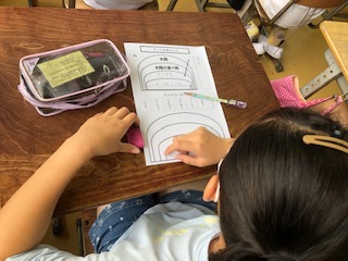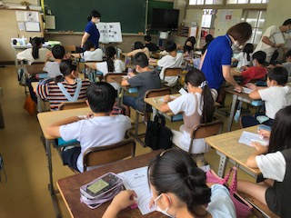 5年生は、「図書館を使った調べる学習」の出前授業で、図書館の方のお話に沿ってテーマを決めて、テーマに関わる、より具体的な何を調べるかを考えてワークシートに書いています。