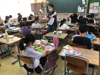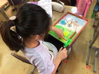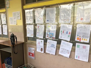 4年生のこのクラスは図工のコリントゲームを製作中です。板に思い思いに絵を描き、何箇所かに慎重に釘を打ちます。初めての釘打ち体験です。右下にゴムをつけると、ちょうどパチンコの原理で玉が盤の上を釘に引っかかりながら落ちていきます。廊下の新聞掲示では、ある国の世界遺産新聞もあって面白いです♪