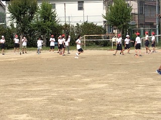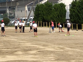 6年生の2クラスは運動場で体育をしています。自分たちでルールもわかって試合をしています。この前このスポーツの名前を聞いたのですが、…「Tボール」でした。ピッチャーがおらずTの上においたボールを打つので、三振にならずに楽しいのだそうです♪