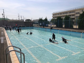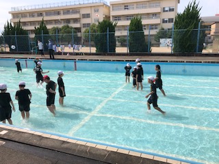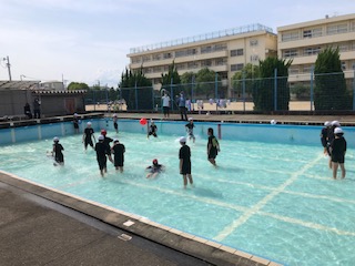 6年生の1クラスはプールにいます。プールバレーをしていますが、泳ぐのが楽しい人たちもいます。水の中で動くことを、浅い水の中で経験して、夏の水辺での安全を守った活動に活かしてもらいたいものです。